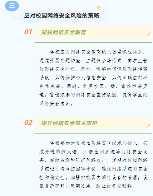 校园网络安全关系到每一位学生的健康成长和学校的稳定发展。我们要以高度的责任感和使命感,扎实开展校园网络安全宣传工作,让学生们在安全、健康的网络环境中学习和成长,共同为校园网络安全筑起一道坚固的防线。