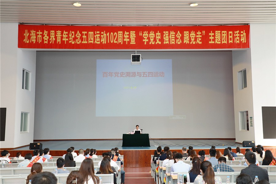 4月30日上午,共青团北海市委员会在北海艺术设计学院西校区大礼堂开展北海市各界青年纪念五四运动102周年暨“学党史 强信念 跟党走”主题团日活动,全市各界优秀青年代表和高校学生400余人参加,市委常委、组织部部长蔡立华出席并讲授党课,团市委书记袁斌主持。