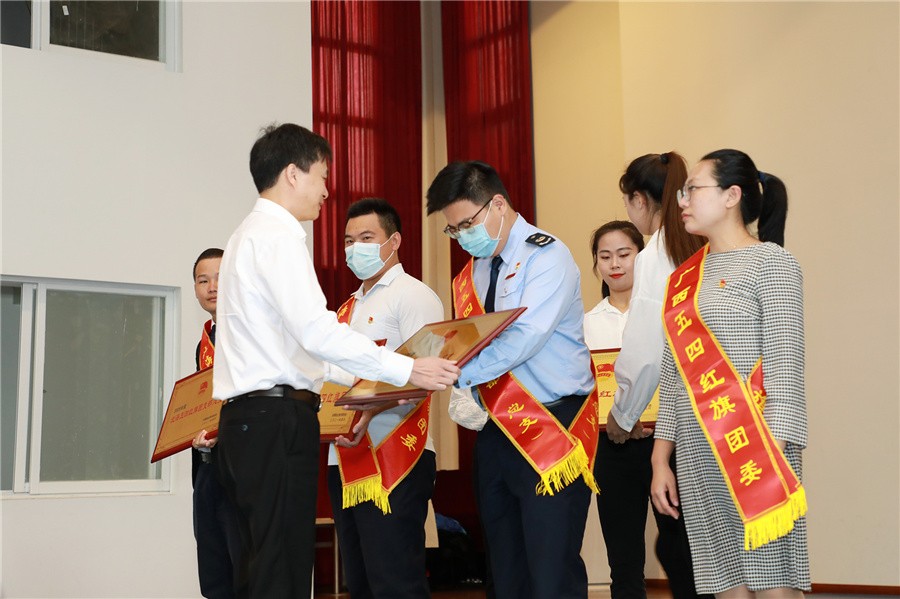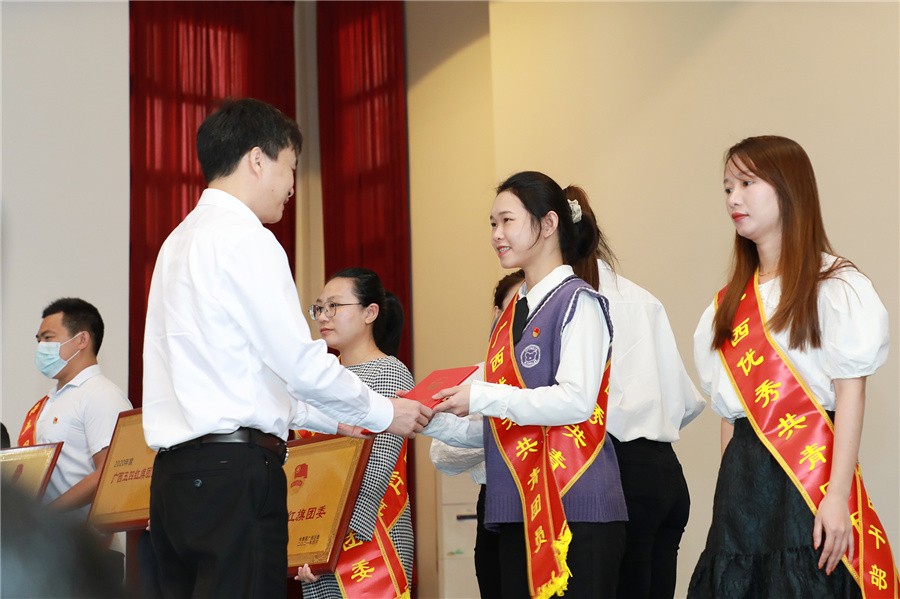 会上蔡立华为荣获广西和北海优秀共青团员,优秀共青团干部,五四红旗团委、团支部代表颁奖。