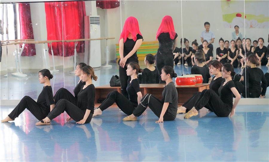 观看学生排练党史题材舞蹈《八女投江》