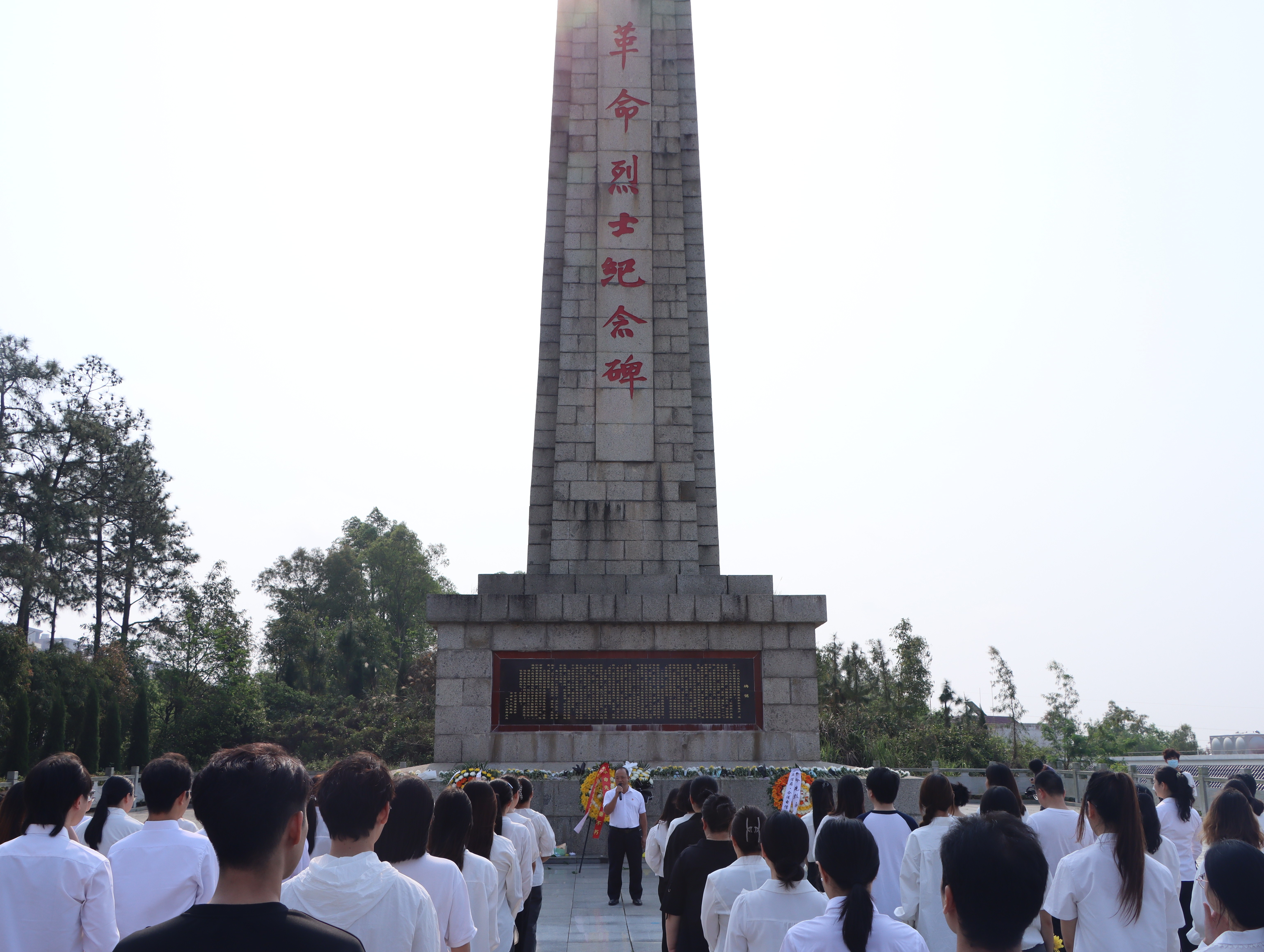 活动开始,在全体师生齐唱《中华人民共和国国歌》之后,由党、团员代表致词。党员代表陈凤康同志提出:牢记历史·不忘过去;珍爱和平·开创未来,我们应当好好学习,努力工作,强健体魄,建设富强的社会主义中国,才能对得起为之牺牲的革命先辈们,才有能力守护好这份来之不易的和平。团员代表林怡蓉同志表示:革命先烈们用生命和鲜血谱写了壮丽的赞歌,为我们留下宝贵的精神财富和不可磨灭的历史印记,作为新时代的青年,要传承红色基因,激发广大人民群众的爱国热情和民族自豪。随后,由献花队伍向革命先烈献上花篮,校党委书记范徽忠整理挽联并与师生们进行了默哀仪式,最后全体师生向烈士行三鞠躬礼,瞻仰烈士纪念碑,敬献手持花。