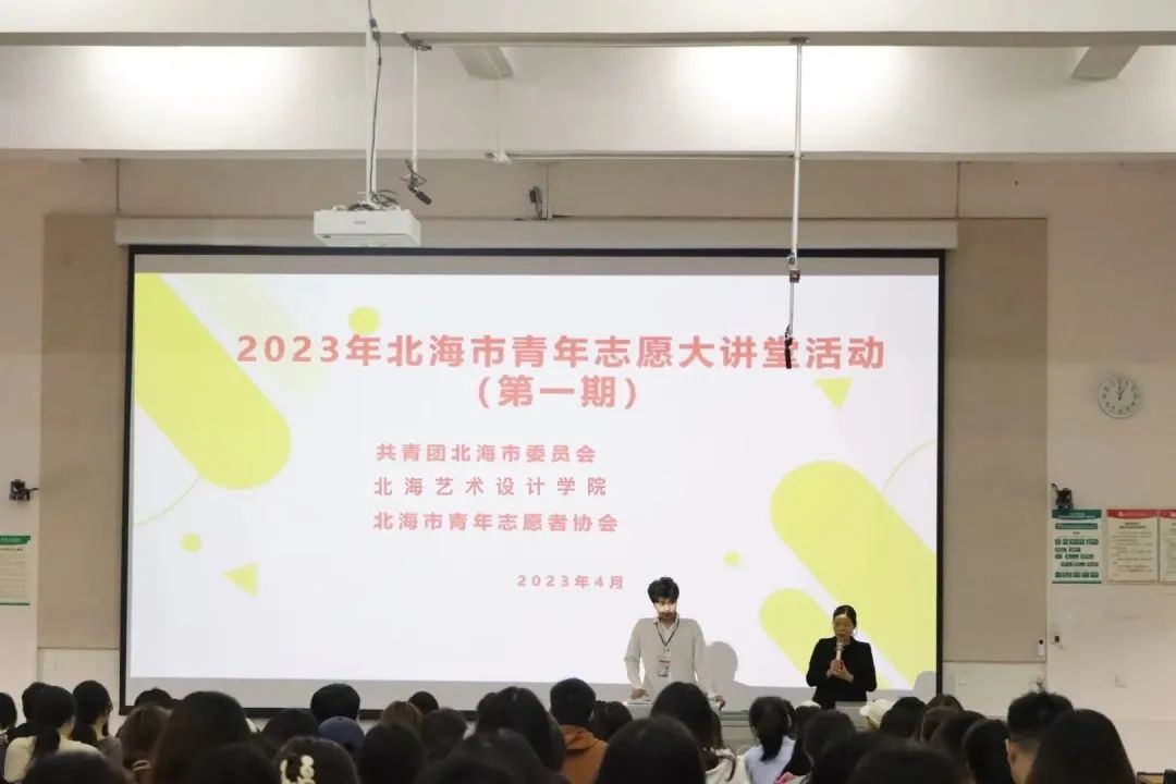 各学生完成签到并入座,志愿者培训正式开始。校团委青年志愿者协会各部门介绍其内容,随后由北海市青年志愿者协会负责人王柳妮给大家进行志愿者培训。负责人为志愿者讲解了志愿服务基础知识,“桂志愿”平台操作及相关注意事项。