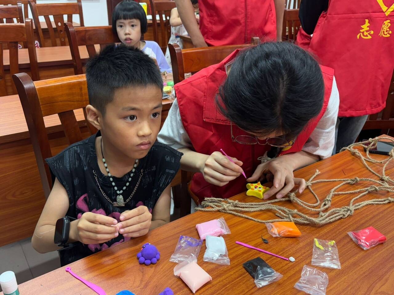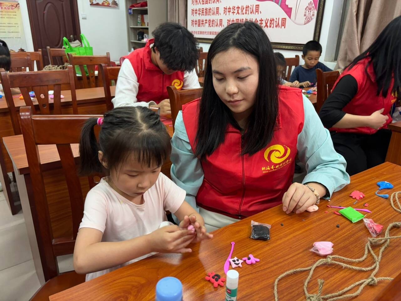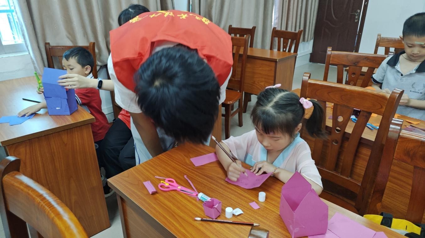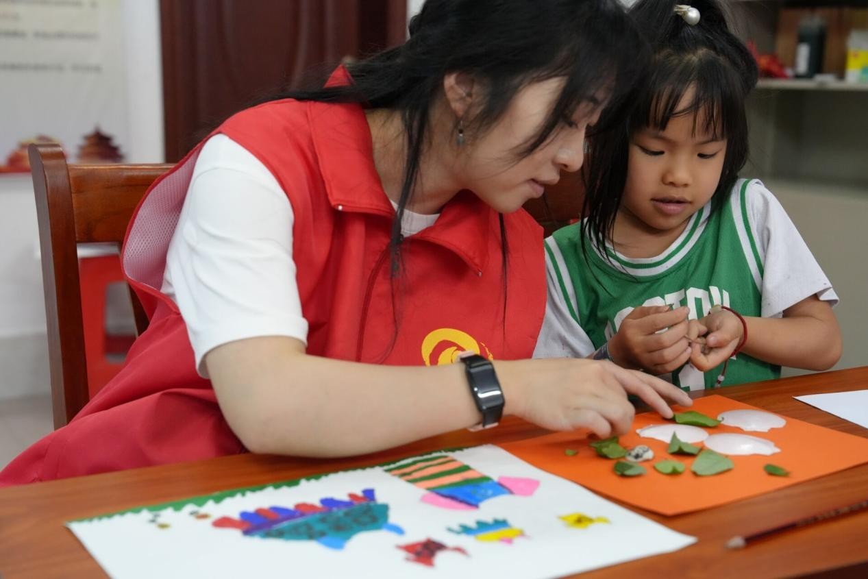 手工课堂上,志愿者引领孩子们踏上一场艺术探索之旅。孩子们在彩泥的塑形中学会色彩与形态的创新搭配;在折纸折叠与树叶拼贴中感悟自然的奇妙与魅力;在垃圾分类箱制作中学会垃圾分类知识。志愿者鼓励小朋友大胆尝试,用双手创造属于自己的艺术作品。别开生面的手工课堂不仅展现了小朋友们的才华和创意,还传递了绿色环保的理念。