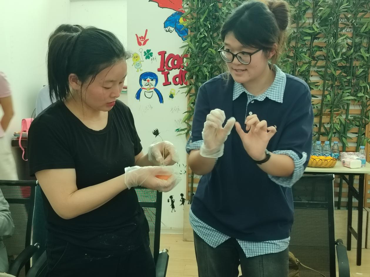 项目团队成员耐心指导参与者制作研磨皂