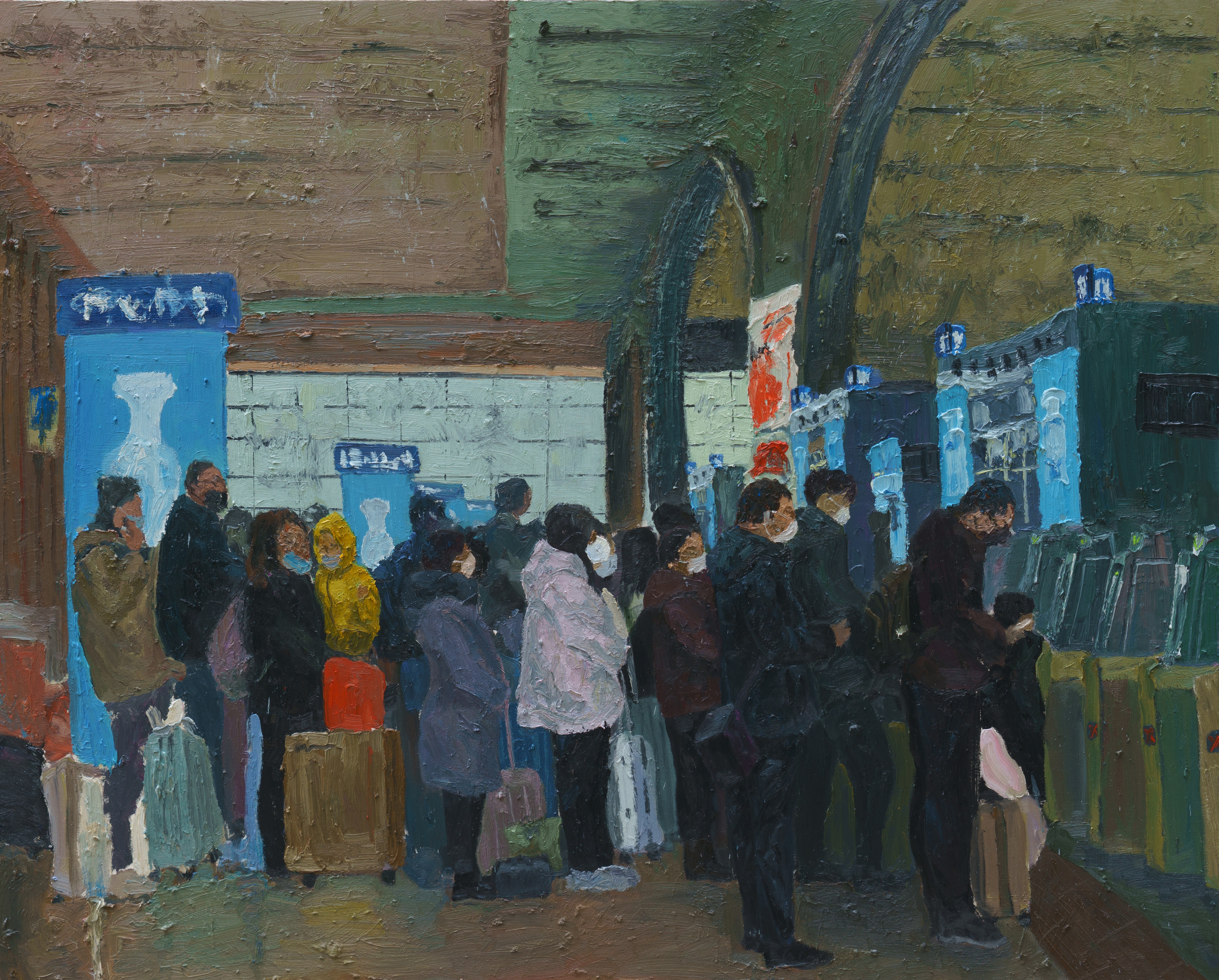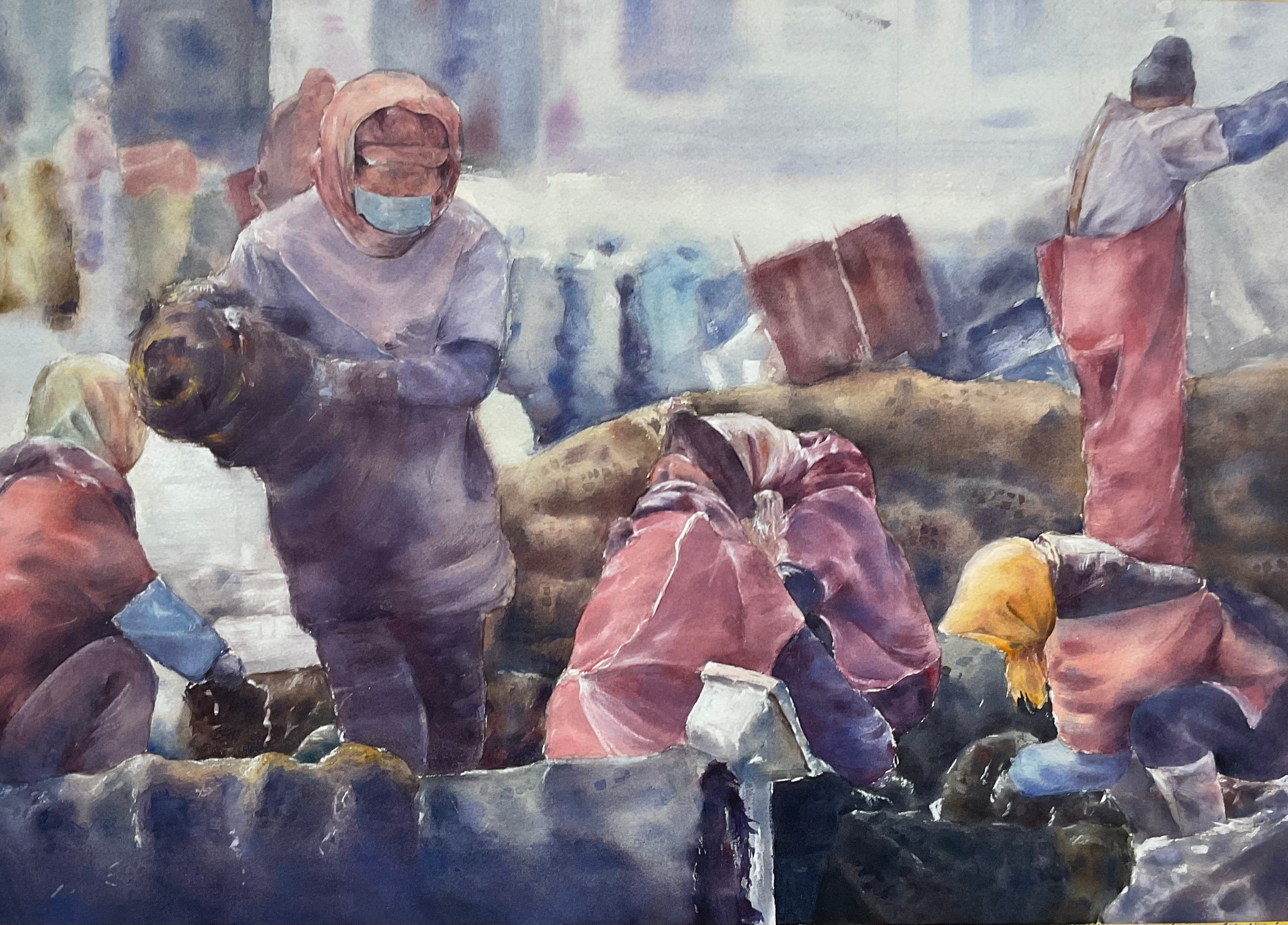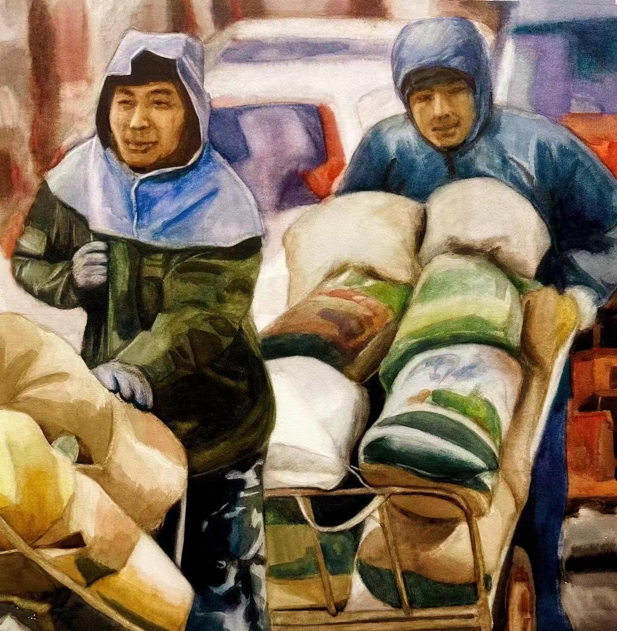 杨圆缘《进城的农民工》 52cm×52cm 2023年 纸本水彩