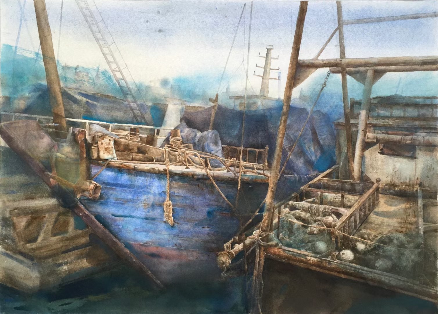 梁晓明《休渔时节》 50cm×55 cm 2023年 纸本水彩