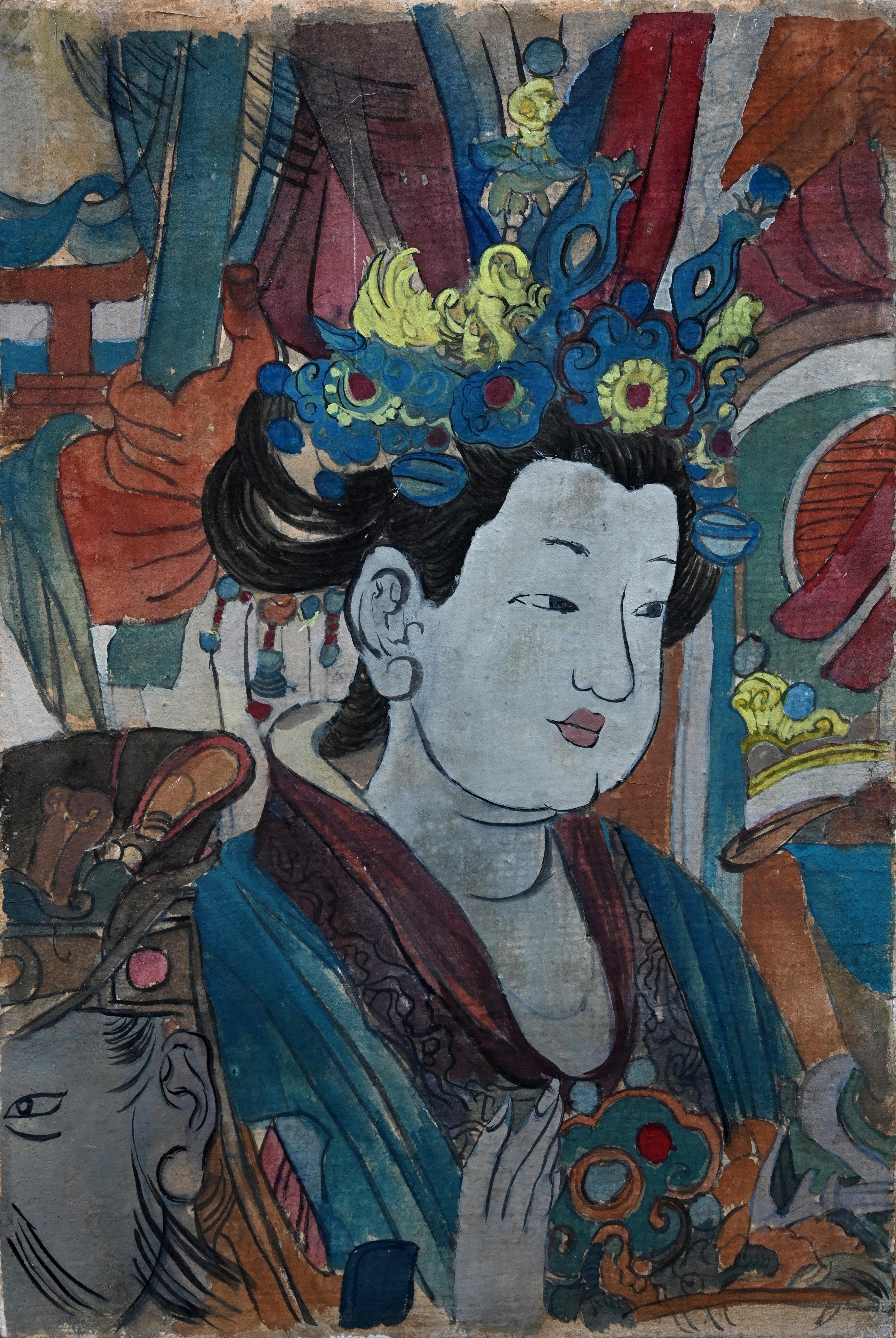 我的专业是水彩。水彩使用水溶性颜料,以水作为媒介,颜料的透明度较高;与中国画有所不同,中国传统壁画则是使用天然矿物色以及水干色颜料,相比水彩更加厚重。水彩的主要技法有:干画法、湿画法、干湿画法相结合,通过笔中水的多少来把握颜色的深浅;中国传统壁画则是先打底稿、再勾线、后画墨稿、最后上色。而敦煌莫高窟在经历了自然灾害后所呈现出的历史的破旧感,与水彩恰好有相似之处。通过这门课程的学习,我发现可以把中国传统壁画的表现方式运用到水彩之中,创新绘画方式,实现多种绘画方式的融合,给我日后的创作带来了全新的视角以及思路。