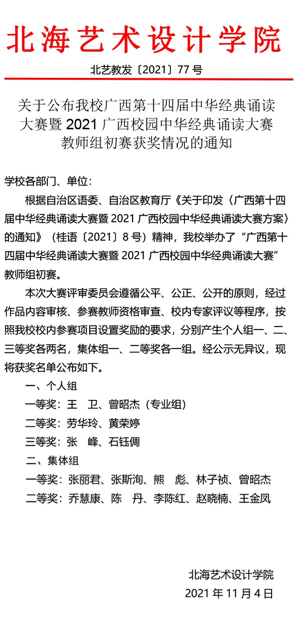 关于公布我校广西第十四届中华经典诵读大赛暨2021广西校园中华经典诵读大赛教师组初赛获奖情况的通知