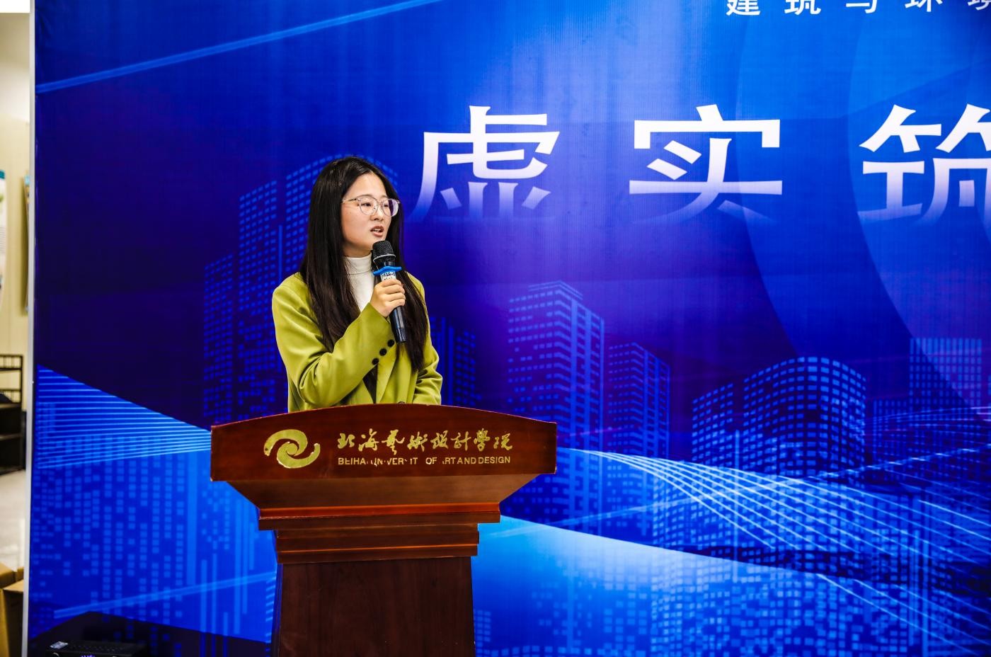 随后,学院副院长蔡世伟上台介绍展览概况。他从展品主题、创作理念、筹备过程等方面展开,全面展现了本次课程成果展的专业水准与育人价值,让在场师生对展览有了更清晰深刻的认知。《环境设计概论》课程负责人陶怡欣老师则详细分享课程建设情况,从课程体系构建、教学内容创新到实践环节设计,重点讲解了课程如何引导学生实现理论与实践的深度融合,以及在培养学生创新思维与跨界融合意识方面的探索,尽显课程的专业深度与教学温度。