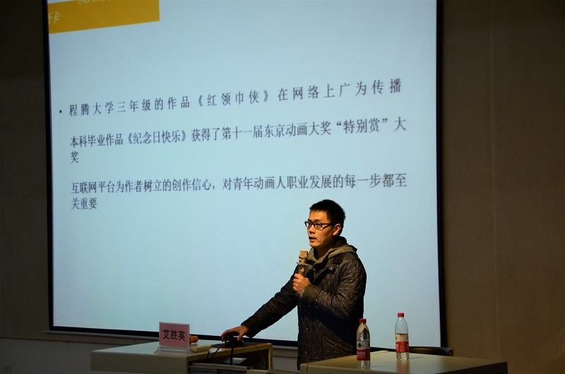 艾胜英教授首先播放中传动画系学生们各个阶段的一些优秀作品:动漫形象兔斯基、三国杀,动画片《天外有天》、《红领巾侠》,漫画《哑舍》、《馒头日记》等,并指出这些优秀作品的成功,都离不开互联网的运用,图文并茂的展示了动画动漫由书面、影视转化为信息化,给同学们以视听上的震撼。