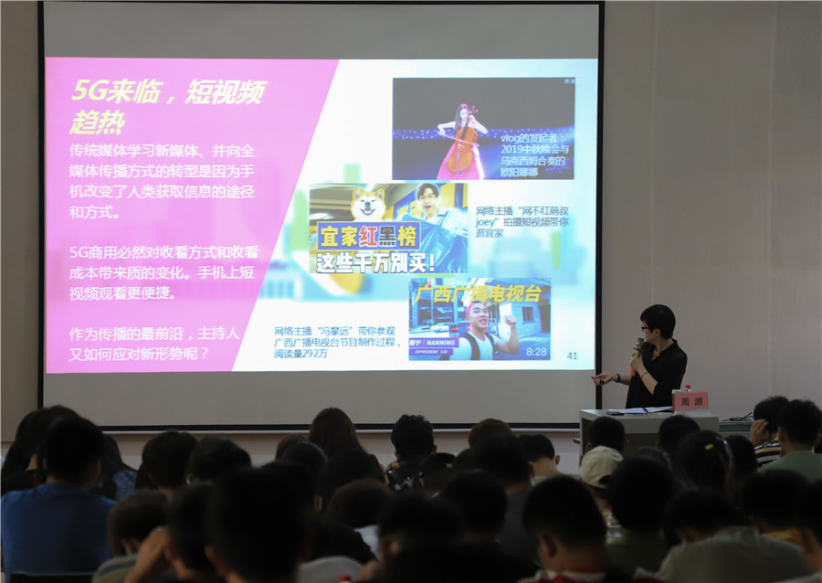 2019年9月19日下午3:00我校西校区伦理楼107坐无虚席,广西广播电视台播音指导周游教授为我们带来一场题为《追本溯源,不忘初心》的精彩讲座。本次讲座由动画学院副院长陶立阳主持。