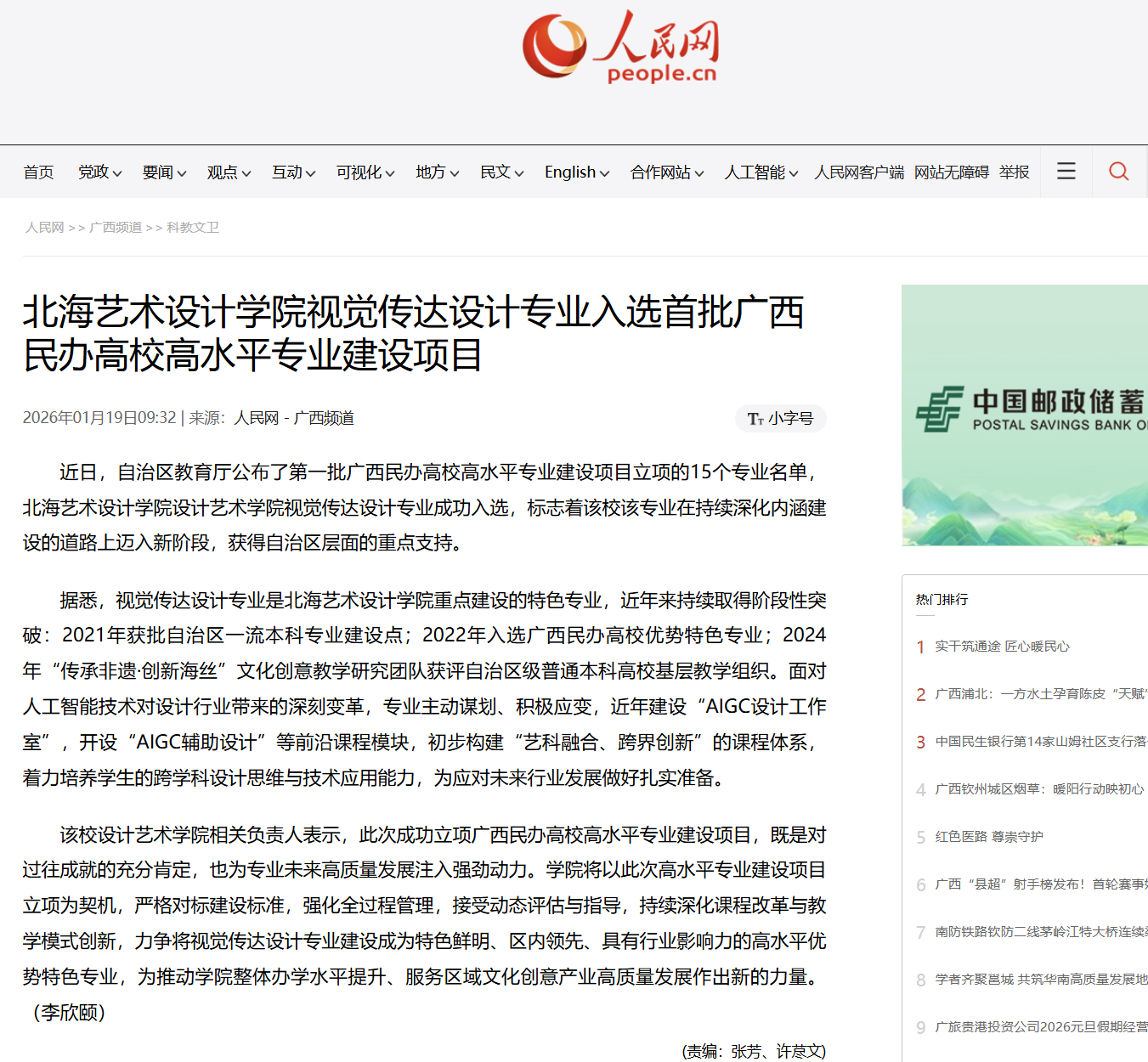 人民网:北海艺术设计学院视觉传达设计专业入选首批广西民办高校高水平专业建设项目