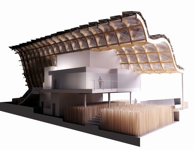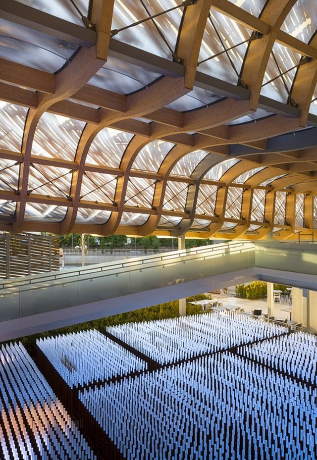 米兰世博会中国馆的主建筑正立面,是整个建筑流线最高潮的部分——高耸的胶合木结构屋架,宛如“群山”造型。中国馆的建筑外形提取了传统歇山式屋顶的造型元素,从空中看,如同希望田野上的一片“麦浪”;从正面看,如同自然山水的天际线;从背面看,又象是城市的天际线。设计师以满腔激情,向中国传统的抬梁式木构架屋顶致敬,也为观众提供了可以纪念留影的巨大空间。