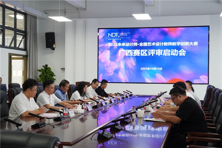 10月15日,2023未来设计师·全国艺术设计教师教学创新大赛广西赛区评审启动会在我校南校区艺德楼八楼会议室顺利举行。未来设计师·全国艺术设计教师教学创新大赛组委会副秘书长潘江华,广西大学艺术学院抗战文艺研究中心主任张明学、桂林电子科技大学设计与创意学院院长葛俊杰、广西艺术学院设计学院副院长吴红梅、南宁师范大学美术与设计学院副院长刘晓东,我校党委副书记彭仁,常务副校长胡胜,副校长陶立阳、黄侃明出席会议,学校相关部门及二级学院负责人参加会议。会议由我校教务处处长武鹏程主持。