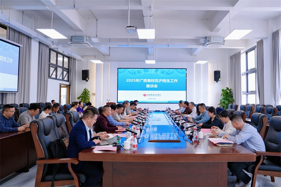 3月3日下午,2025年广西高校在沪招生工作座谈会在我校八楼会议室举行。上海市教育考试院副院长常生龙一行,广西各相关高校招生部门负责人,我校校长卢新华,常务副校长胡胜,副校长邱杰、陶立阳、包建明及相关处室负责人参加了座谈会。会议由我校副校长邱杰主持。