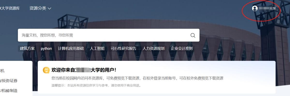 3.验证成功后,网站右上角会出现出对应的高校信息,说明绑定信息成功,后续即可在校外微信扫码访问。
