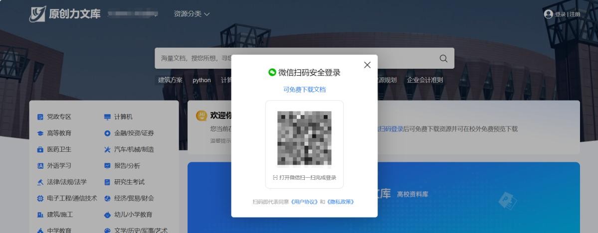 非校园网ip下使用网站时,需微信扫码登录后方可使用。如已在校内有效IP地址绑定过高校信息,微信扫码成功后即可访问资源库,图如下图如示: