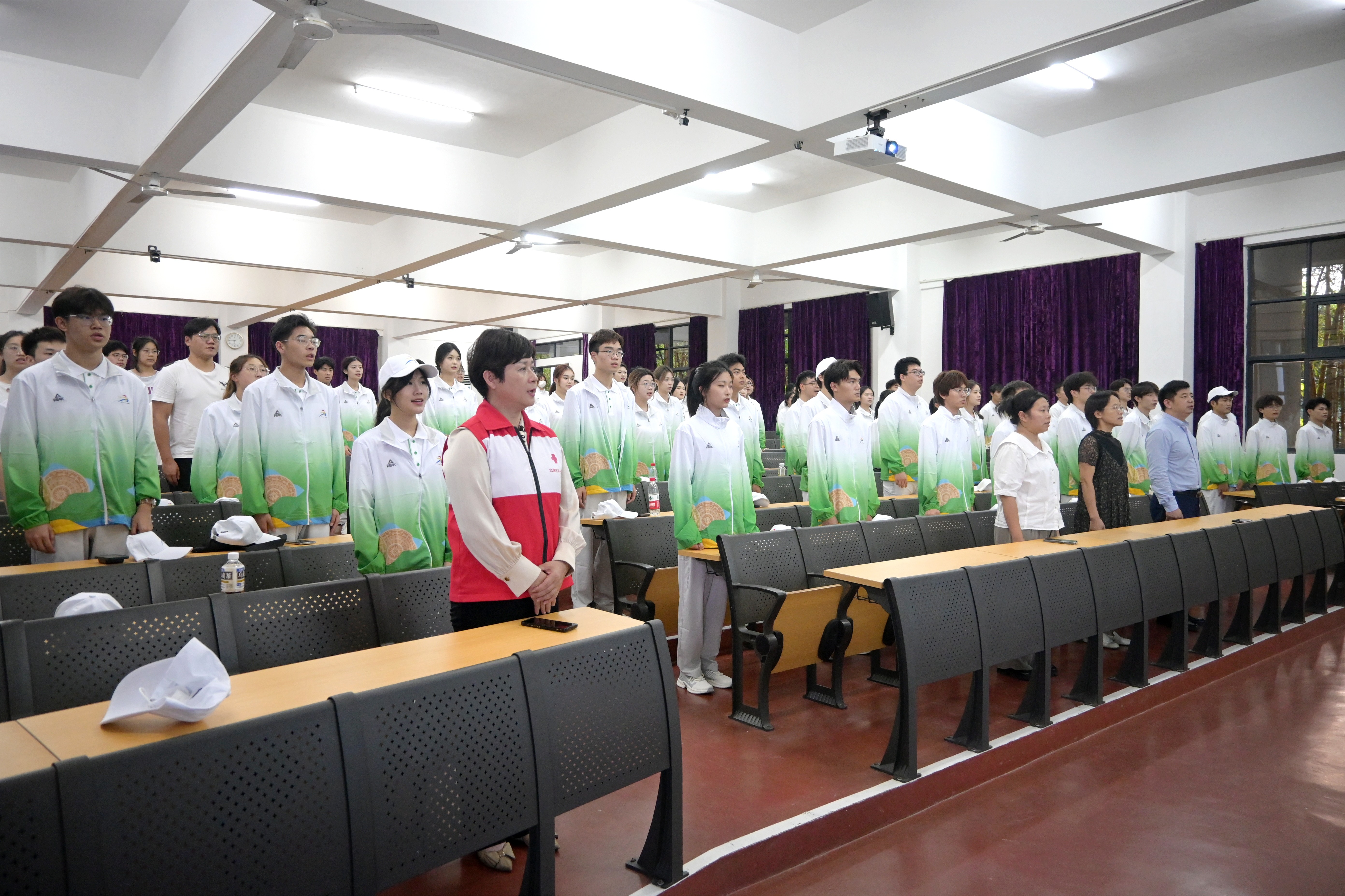 全体志愿者起立奏唱国歌,并集体观看学青会宣传片。
