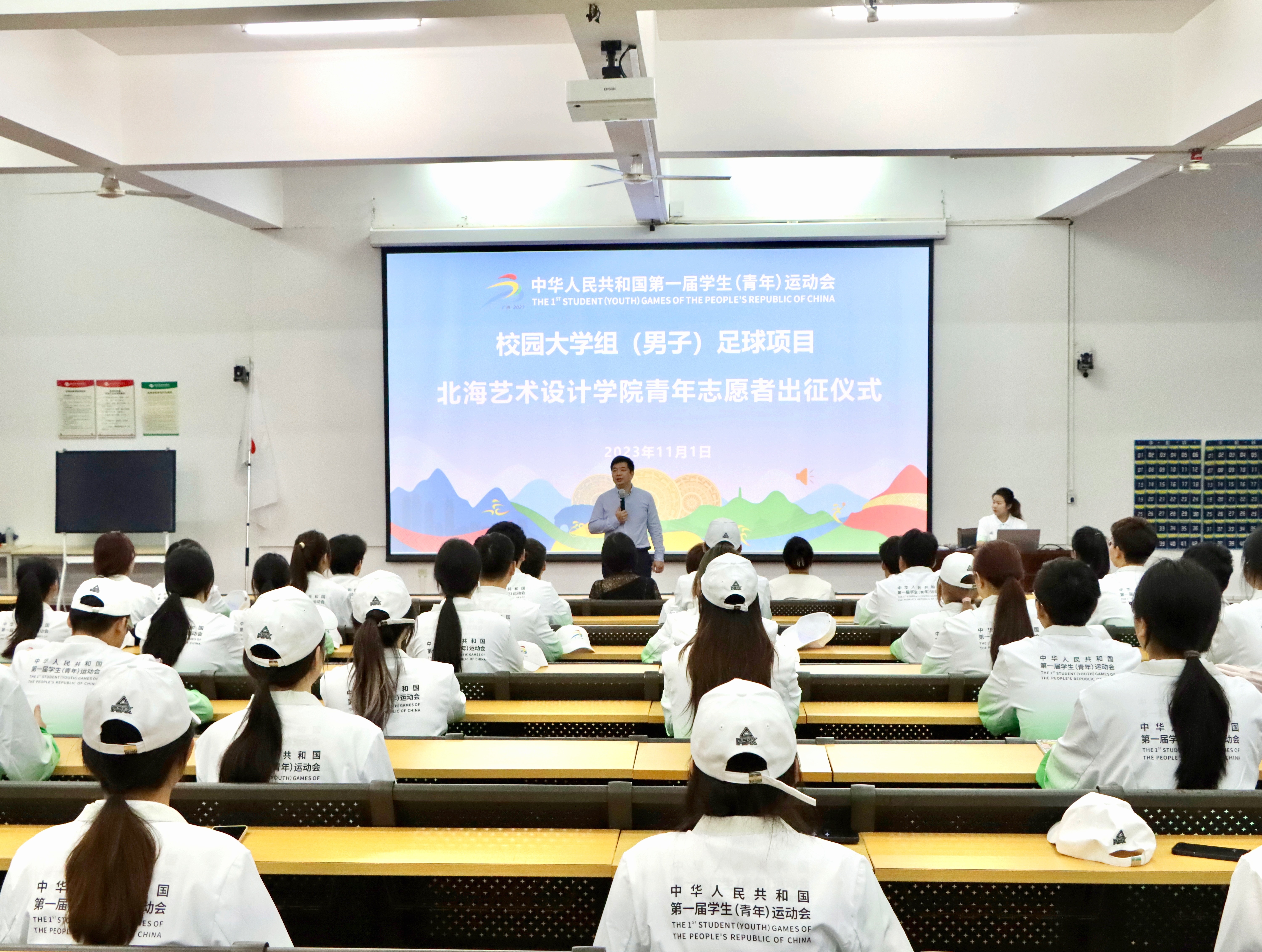 2023年11月1日,第一届全国学生(青年)运动会足球比赛志愿者出征仪式在北海艺术设计学院伦理楼107举行。出席本次出征仪式的领导有第一届全国学生(青年)运动会志愿者经理、市旅游文体竞体科局科长陈瑛,我校党委副书记彭仁,团市委宣传部负责人叶婵,以及全体志愿者和带队老师们。
