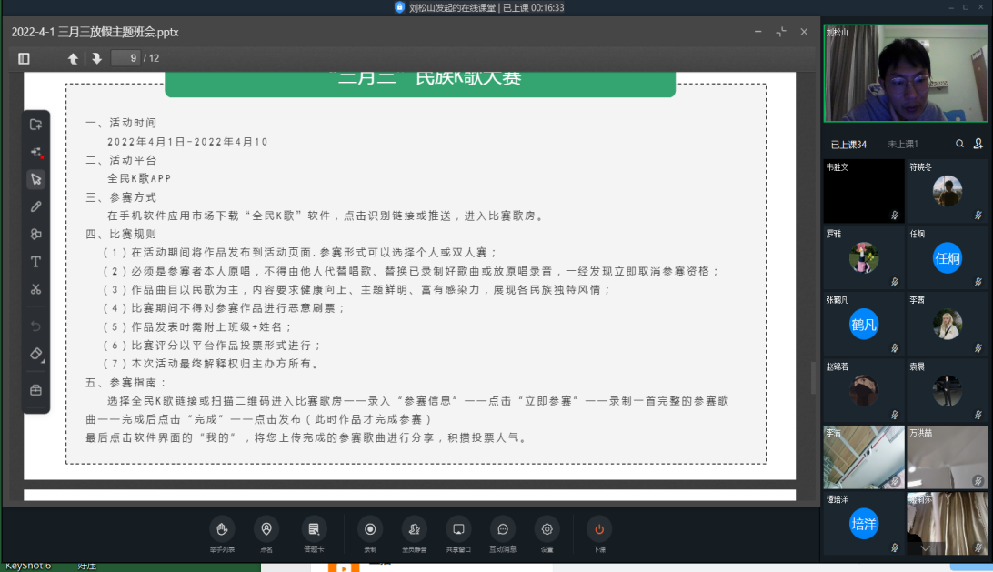 2022年4月2日,美术学院开展了关于三月三放假安全的线上主题班会,会议内容主要是学校关于三月三的放假通知和做好放假期间的安全教育工作。