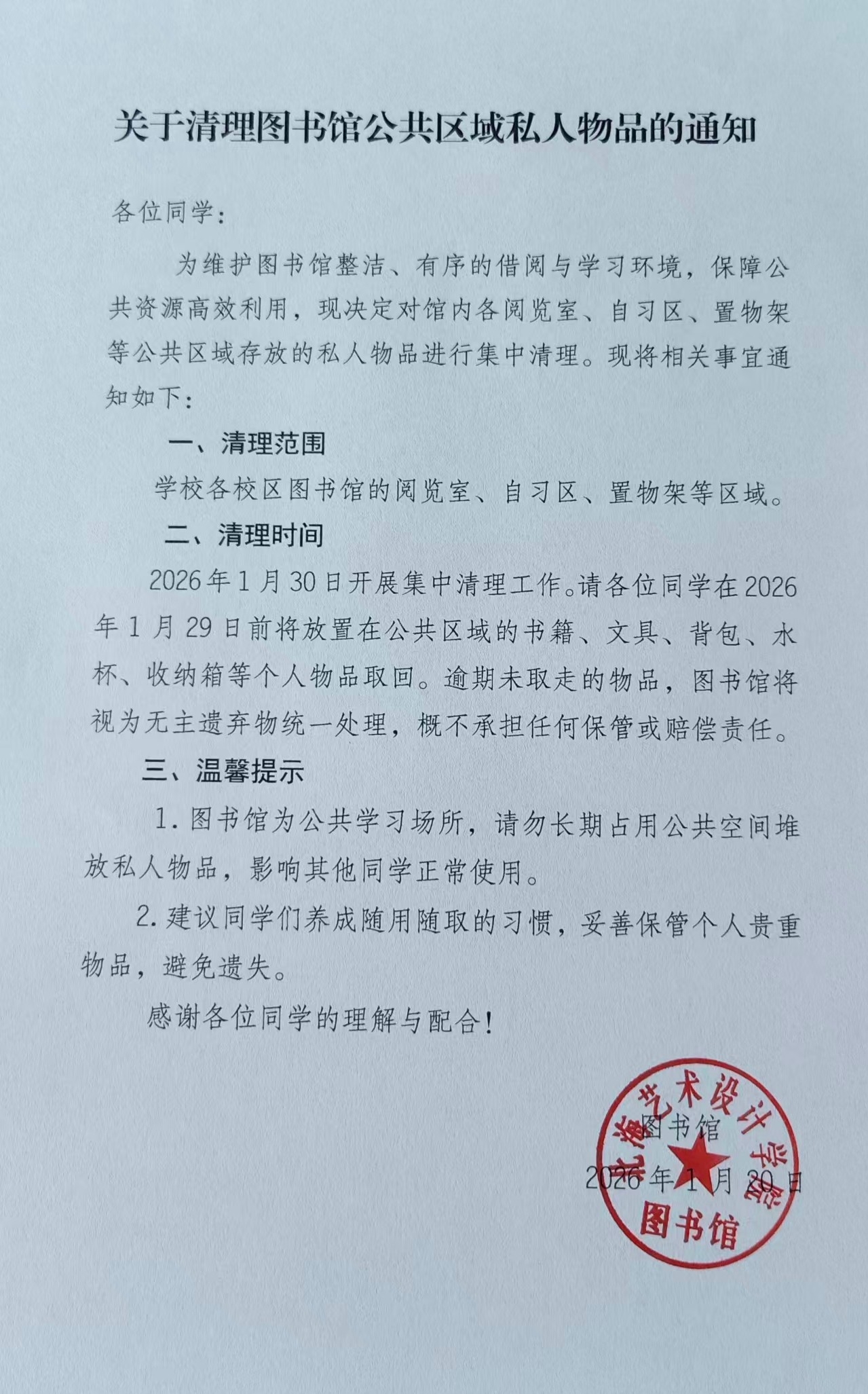 关于清理图书馆公共区域私人物品的通知