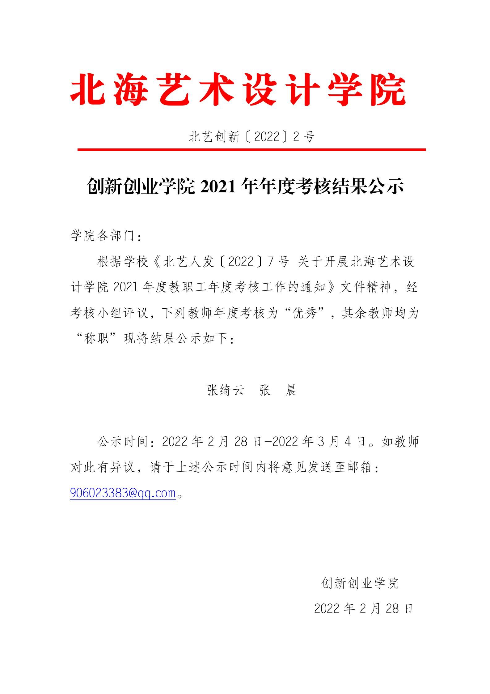 北艺创新〔2022〕2号 创新创业学院2021年年度考核结果公示
