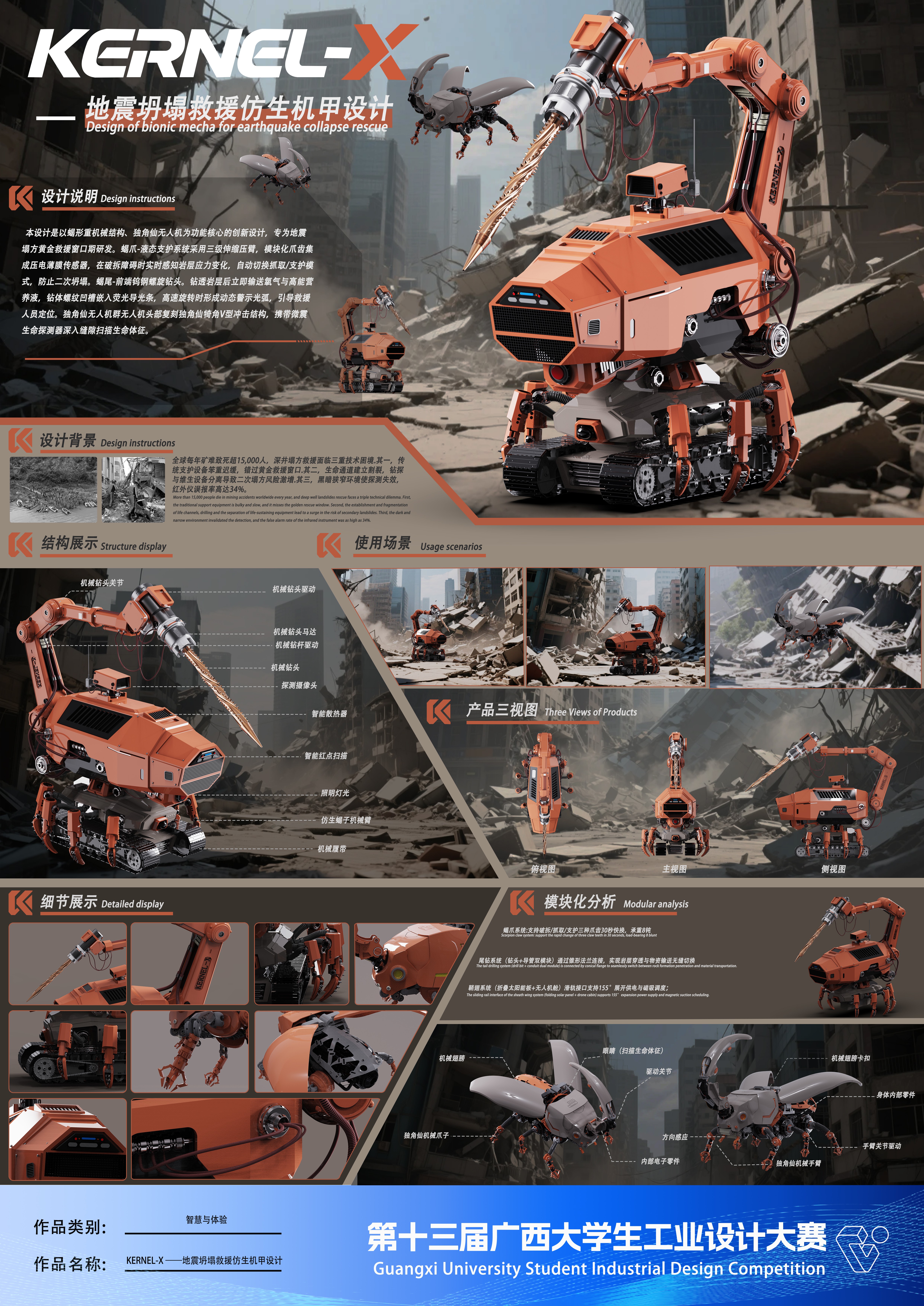 作品名称:KERNEL-X ——地震坍塌救援仿生机甲设计    作者:谭佳汶,江沛,张骊珠