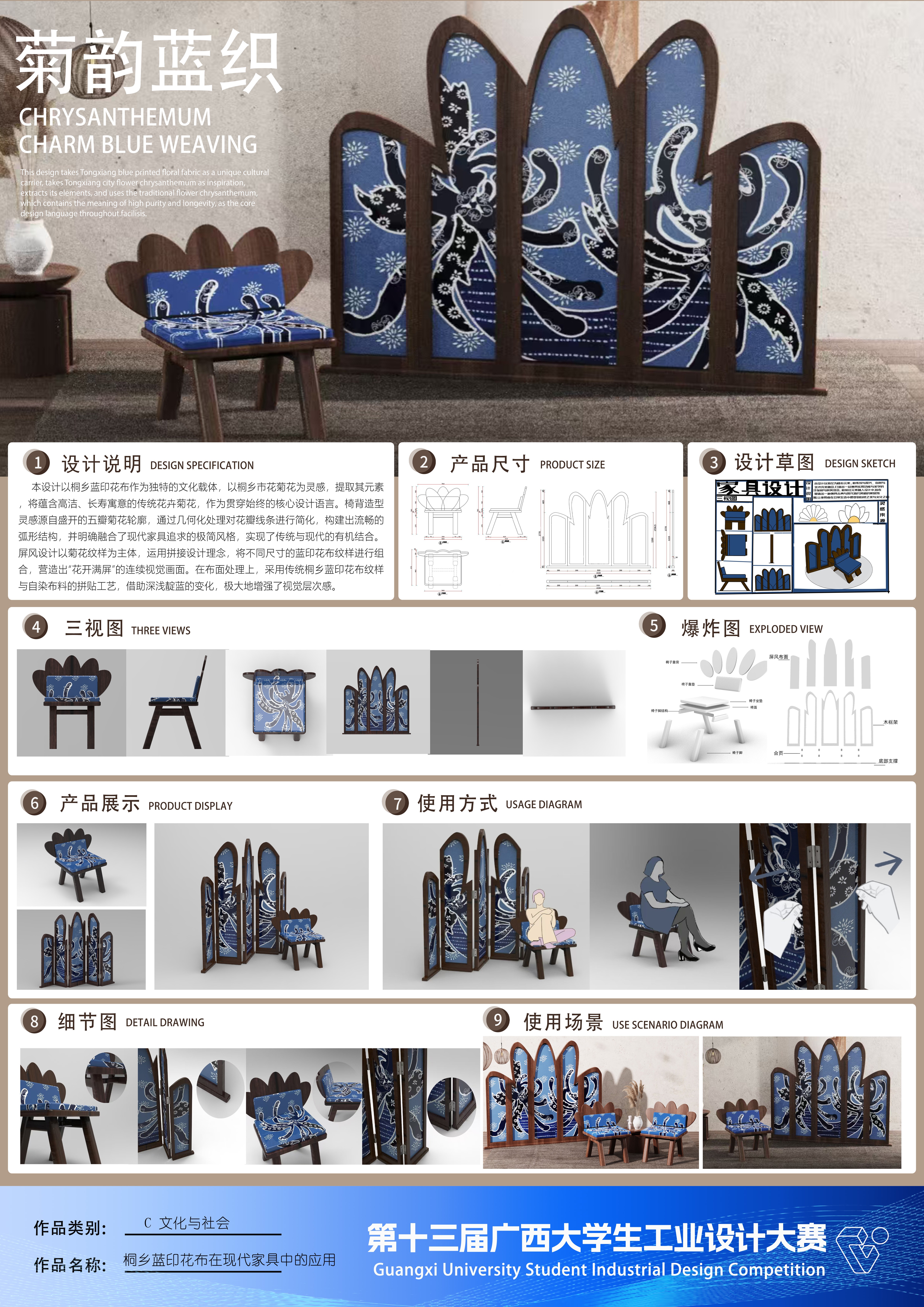 作品名称:桐乡蓝印花布元素在现代家具中的应用    作者:李垚琪