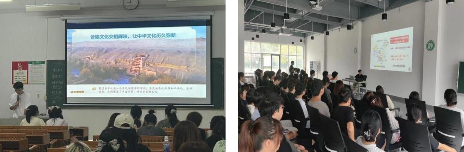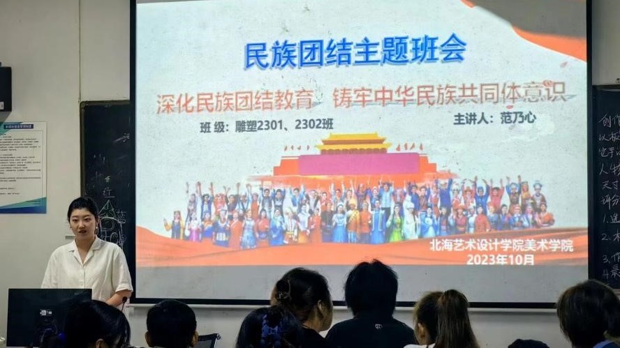 其中雕塑2301、02班,辅导员范乃心以集中宣讲的形式开展,该班活动分为以下几个部分:1.提问导入 2.教师宣讲民族团结内容 3.辅导员领学《高校宗教工作有关法律法规》4.总结。在教师宣讲中,学生加深对民族团结政策、宗教法律法规和中华民族共同体意识的认识。