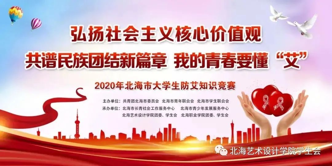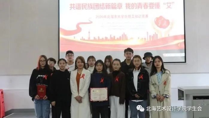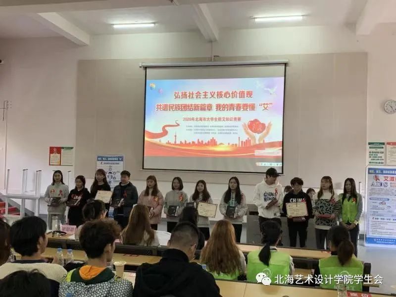 11月29日上午,由共青团北海市委员会、北海市青年联合会、北海市学生联合会主办,北海市长青社会工作服务中心、北海市青少年发展服务中心、北海艺术设计学院团委、学生会、北海职业学院团委、学生会共同承办的“弘扬社会主义核心价值观  共谱民族团结新篇章”我的青春要懂“艾”——2020年北海市大学生防艾知识竞赛活动在我校举行。来自北海职业学院及北海艺术设计学院的6支高校学生队伍参与竞赛,100余名大学生现场观赛。