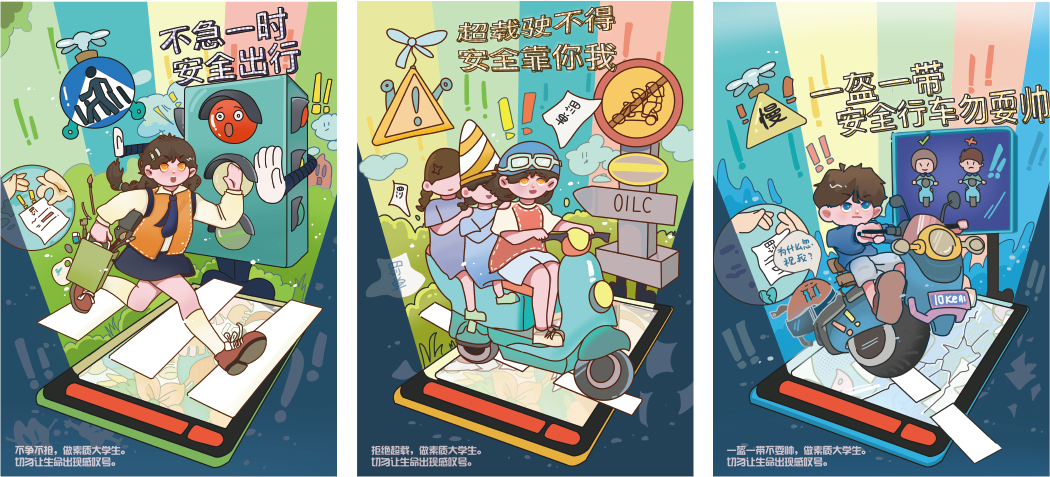 海报类:优秀奖 《交通安全系列作品-勿闯红灯,戴好头盔,请勿超载》