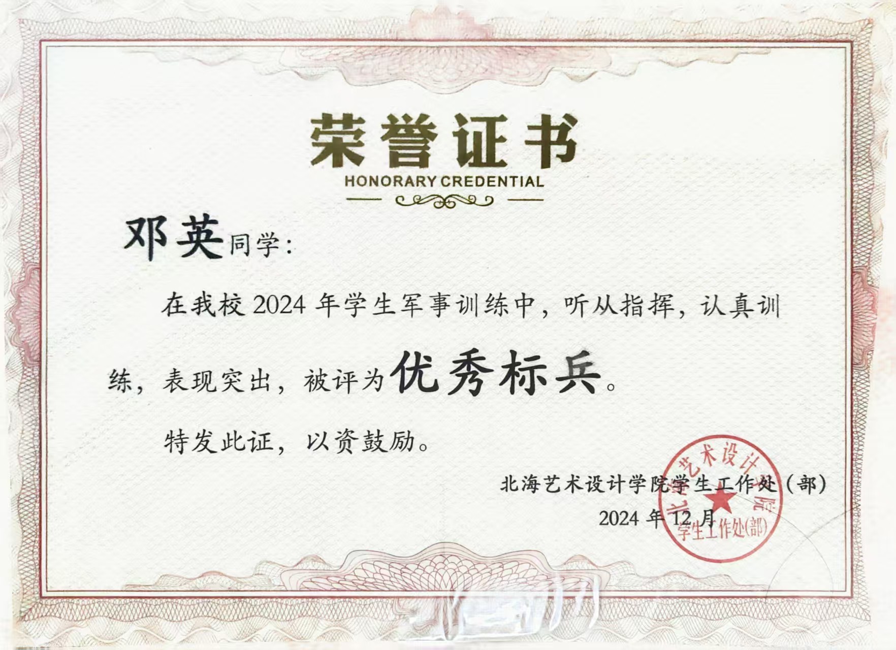 2024年12月 在学生军事训练中被评为“优秀标兵”;