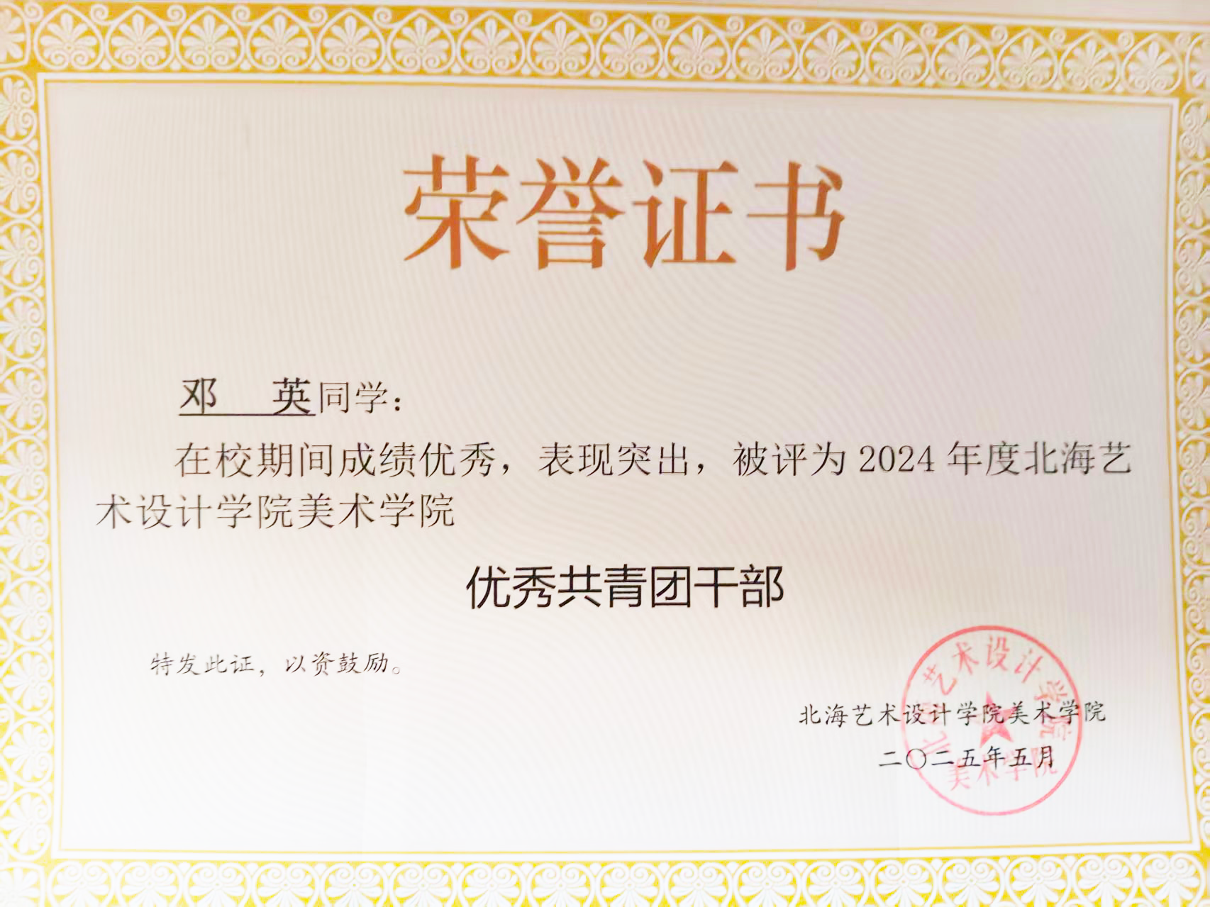 2025年5月 获2024年度北海艺术设计学院“优秀共青团干部”称号;
