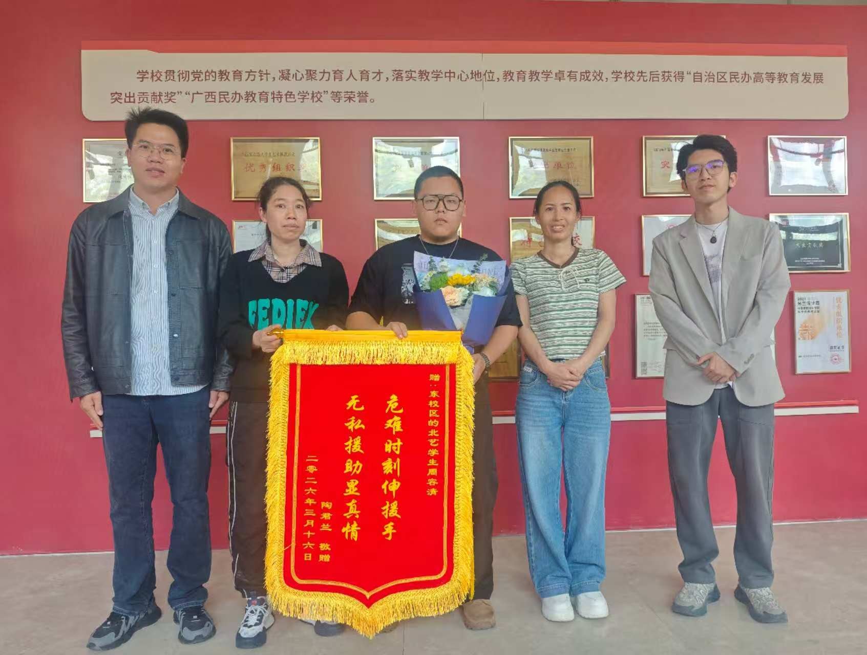 为表彰先进、弘扬正气,美术学院专门举行表彰仪式,学院副院长林昌华、班级辅导员林盼鑫一同出席,被救学生家长专程到场赠送锦旗致谢。