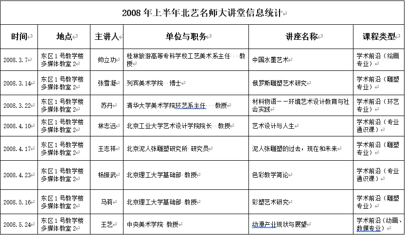 2008年上半年北艺名师大讲堂信息统计