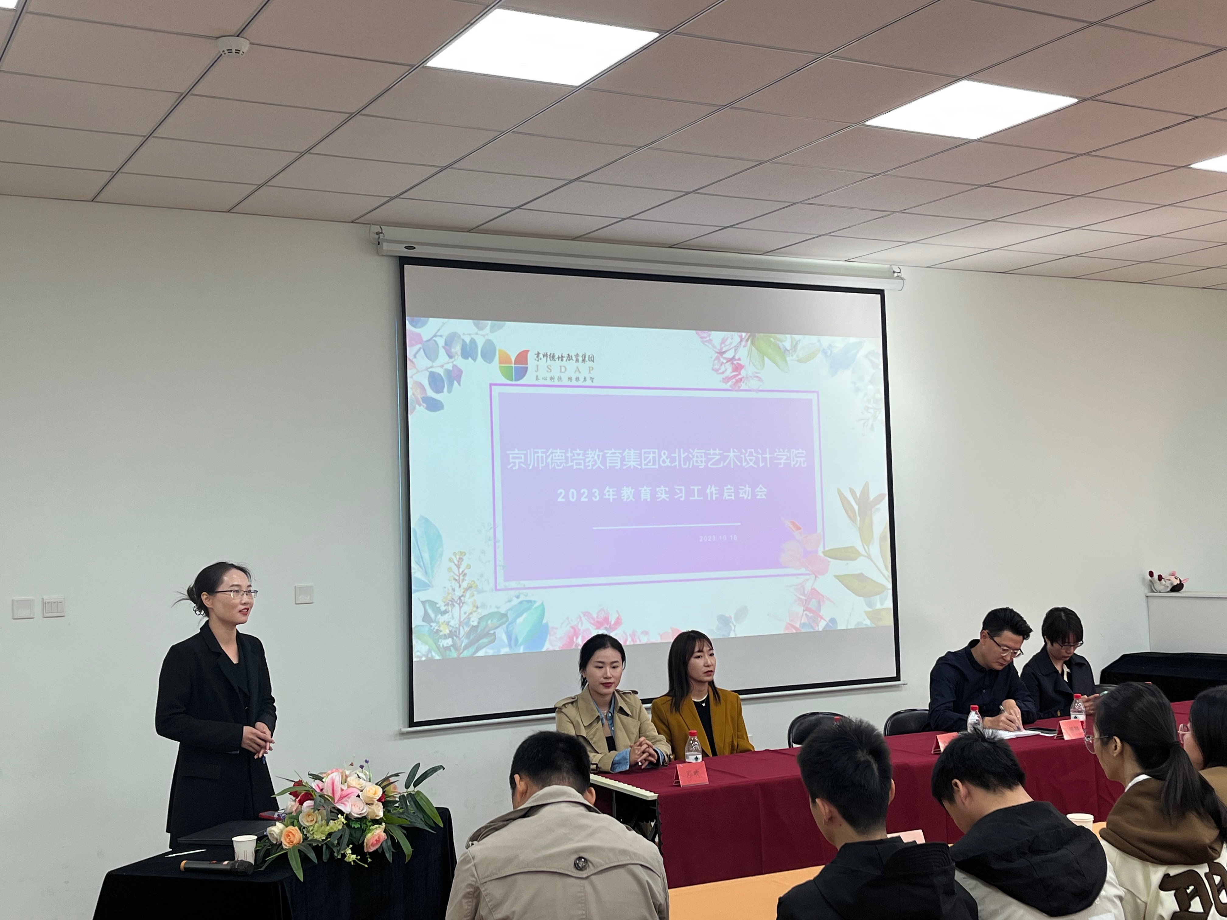 京师德培教育集团总园长丁振鹏、人文教育学院党总支副书记邓欢、北京实践基地办公室副主任严腾、学前教育教研室主任蒙剑英、实验室副主任冯小霞、2020级辅导员孔德相、京师德培教育集团各园长,以及2024届学前教育专业在该集团集中实习的39位同学出席会议。会议由京师德培教育集团人事负责人马艾萍主持。