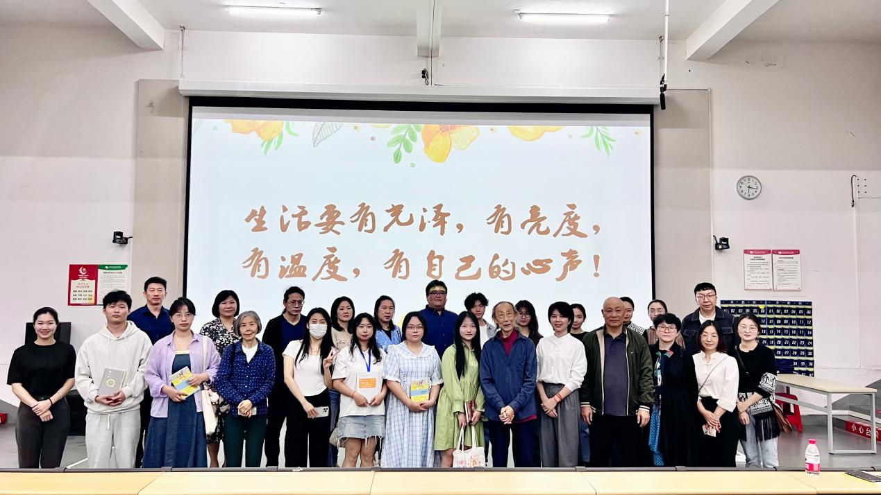 最后,讲座在现场热烈的掌声中落下帷幕。这场讲座不仅让学生们感受到李教授对法国文学的热爱和执着,更让他们对文学翻译有了更深入的认识和理解。讲座结束后,李教授将自己的著作赠送给讲座现场参与互动的学生,并与听讲座的师生合影留念。(陈贞考/摄)