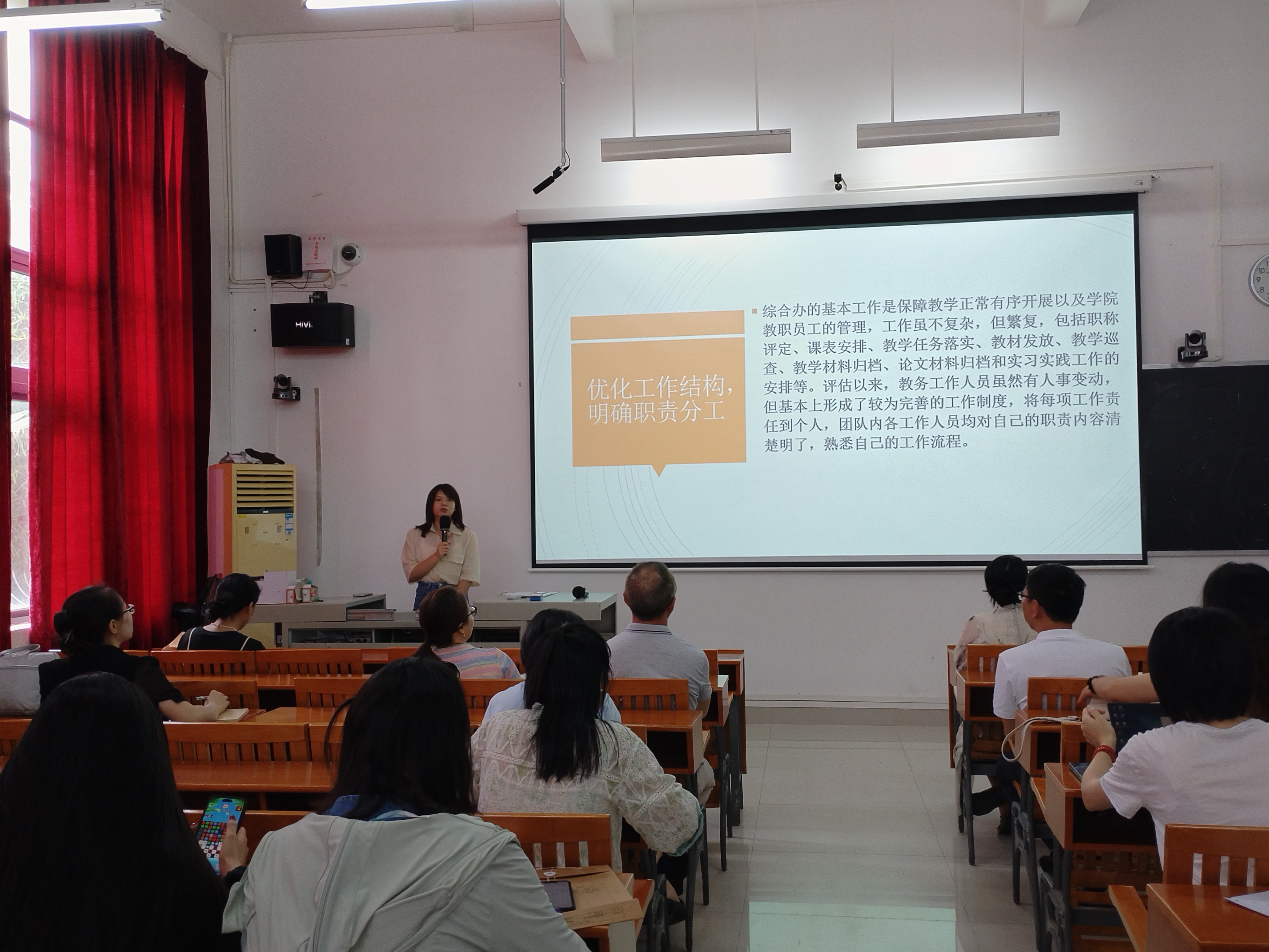 会议开始,哲学、艺术教育、舞蹈表演、学前教育、汉语言文学、汉语国际教育教研室及学院各职能部门分别进行总结。总结中,各专业教研室和部门都围绕我院人才培养方案要求不断推进教学改革、提升人才培养质量。人才培养方案严格执行不断完善,青年教师培训卓有成效、课程建设各有特色、教学成效显著,特别是在学科融合发展方面取得实质性的成果。其中哲学专业升学和录取率取得突破性成绩。