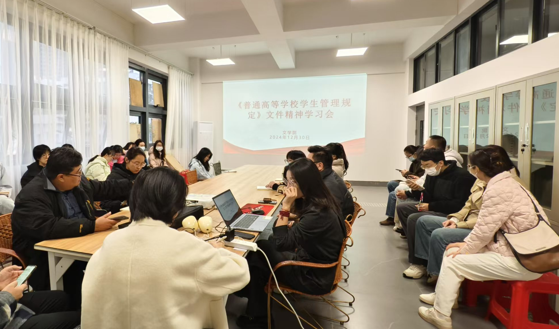 此次学习会议的召开,不仅提高了全校教职工对《普通高等学校学生管理规定》的参与度,更促进了大家对文件精神的深刻领会和准确把握。学院将以此次学习会议为契机,进一步加强学生管理工作,完善学籍注册制度,确保高等教育的公平公正和学生的合法权益得到有效维护。未来,学院还将继续加强相关的学习和培训,不断提升教职工的法治意识和专业素养,为培养德智体美劳全面发展的社会主义建设者和接班人提供有力保障。(曾心怡/摄)