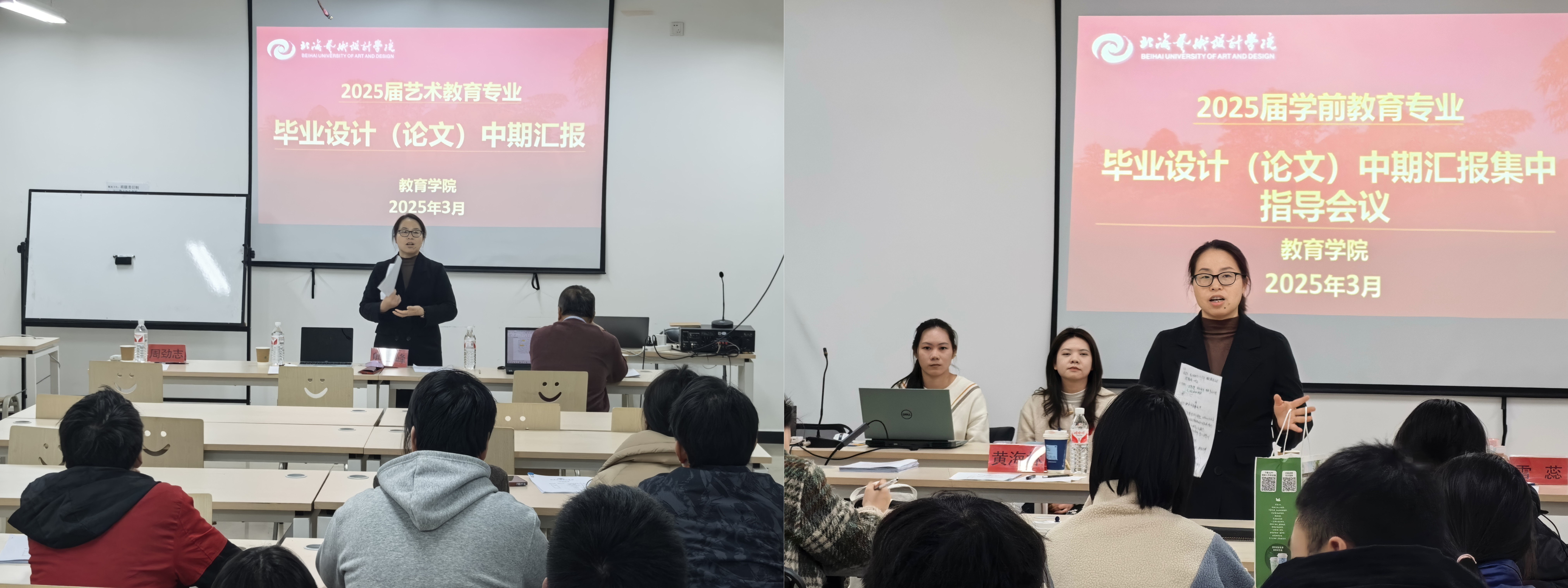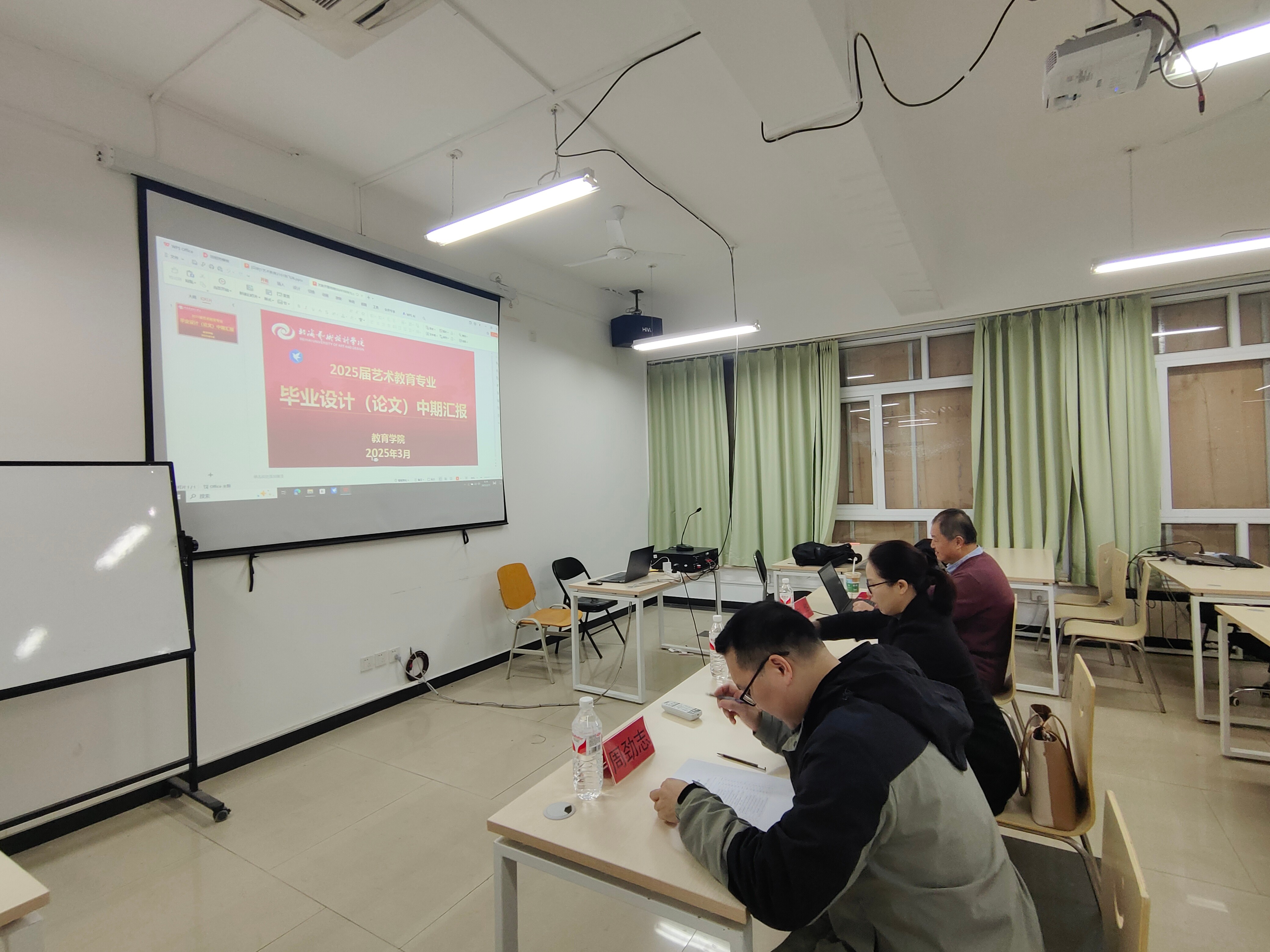 艺术教育专业和学前教育专业于2025年3月11 日至13日开展毕业论文中期汇报工作,参与答辩的老师包括院长熊秀峰、艺术教育教研室副主任周劲志、教务办主任黄海林、艺术教育专业老师赵华教授、学前教育专业雷蕊老师。同时,为了更好地帮助学生完成学业和就业,,各位老师于3月14日进一步深入地开展了个人论文和就业指导工作。