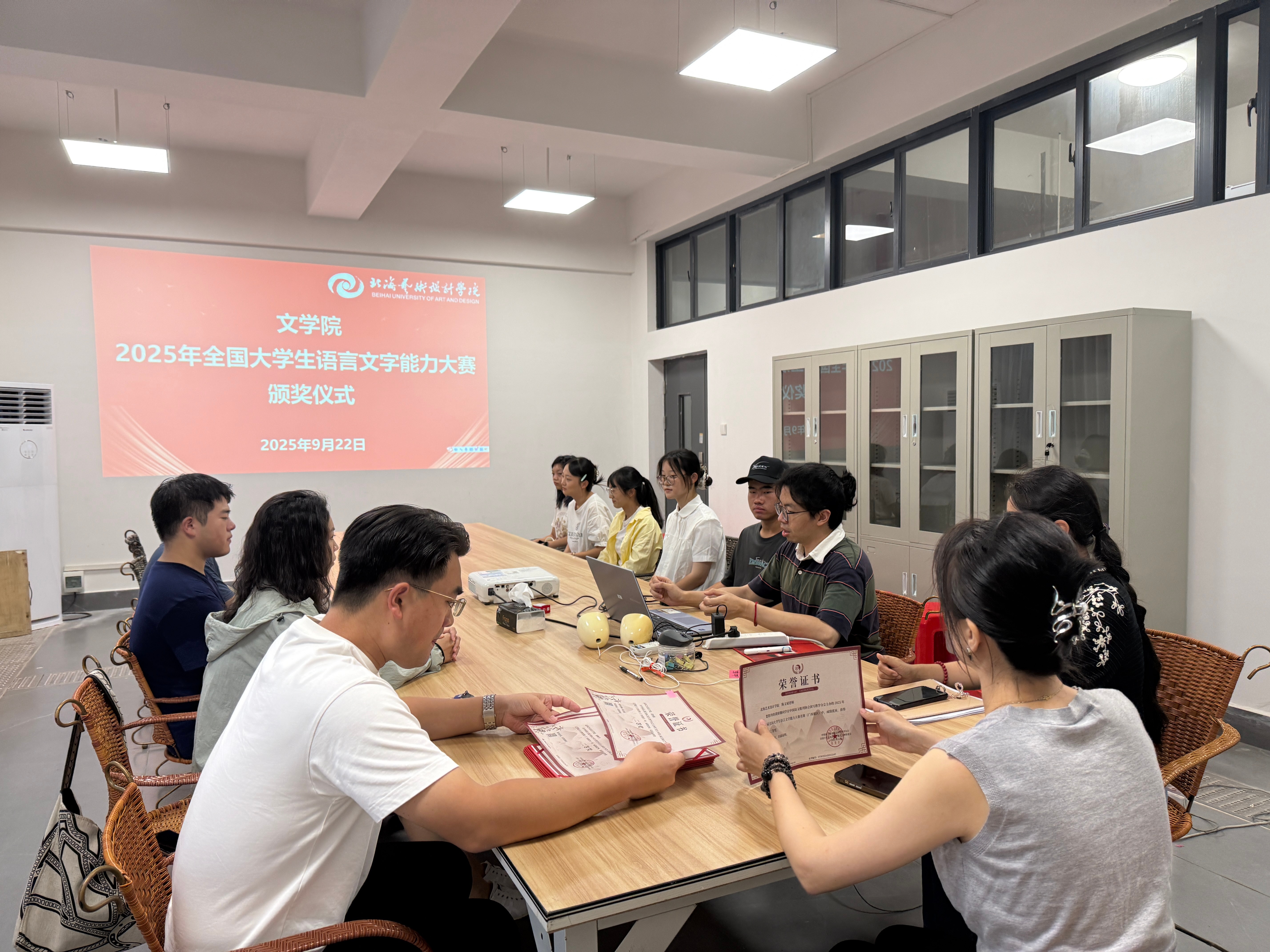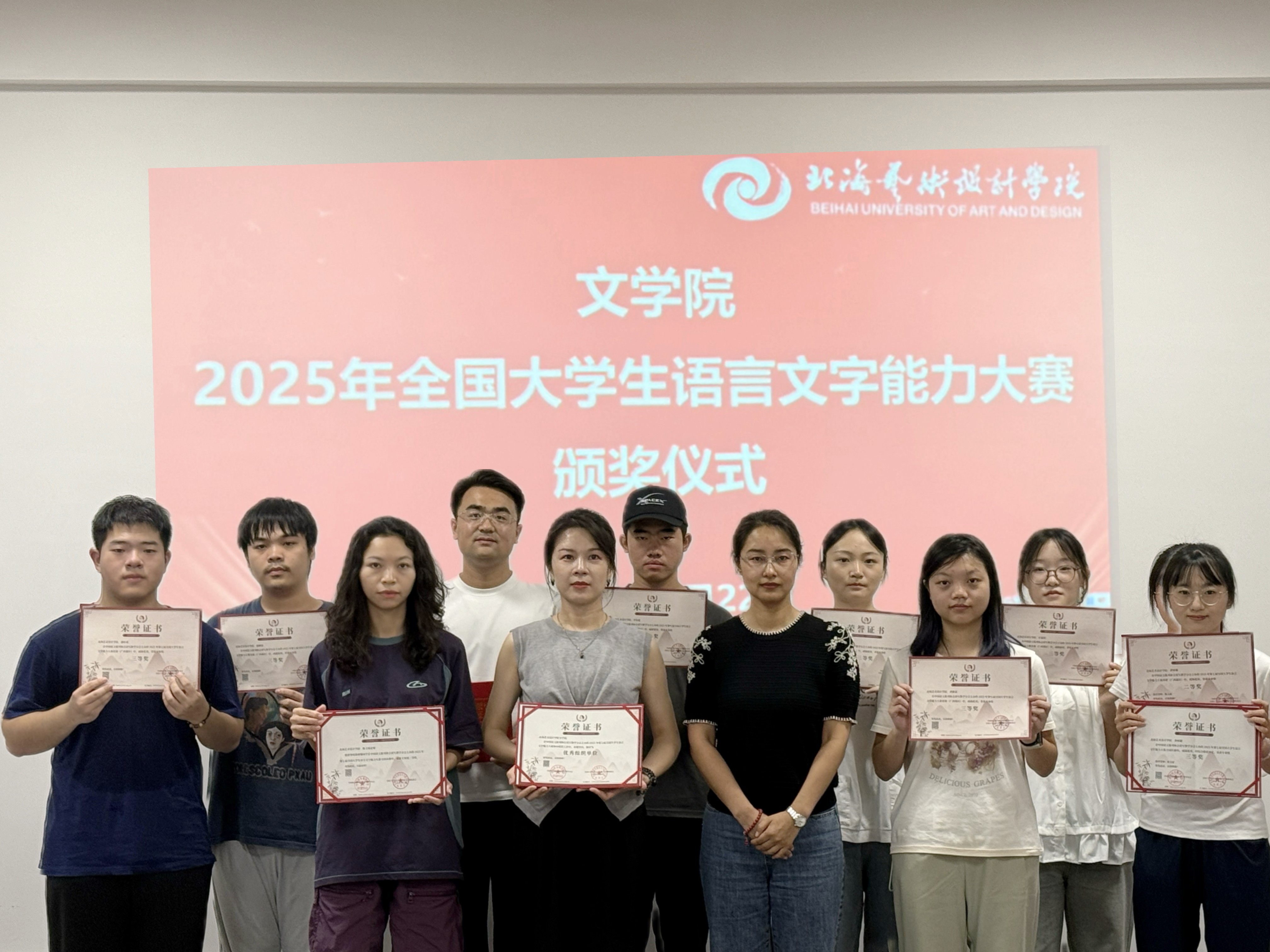 颁奖仪式上,学院领导为获奖师生颁发证书并表示祝贺。本次大赛文学院学子表现突出,共获得专业组奖项13项。其中,黄妍馨同学荣获全国决赛三等奖,涂煜昊同学获得广西赛区一等奖,黄妍馨2名同学获得广西赛区二等奖,卢群等9名同学获广西赛区三等奖。陈文斌等3名教师获“优秀指导教师”称号。这些奖项不仅体现了学子们扎实的语言文字功底,也展现了文学院教师人才培养的显著成效。此外,文学院凭借出色的赛事组织工作,被大赛组委会授予优秀组织单位荣誉称号。