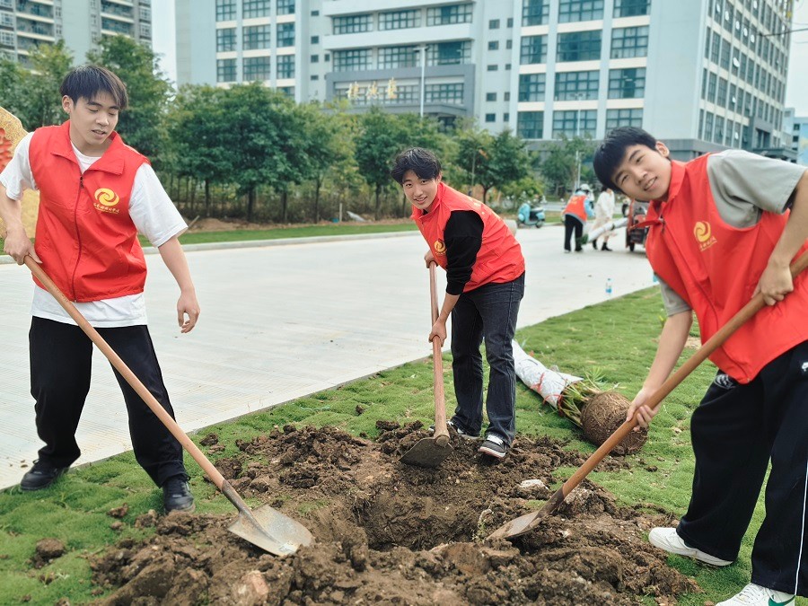 植树现场暖意融融、干劲十足。师生们默契配合,挥锹铲土、扶正树苗、填土压实、围堰浇水,每一个步骤都认真细致、一丝不苟。劳作间隙,大家畅谈生态保护理念,交流校园绿化心得,将对校园的深切热爱、对绿色生态的美好向往,尽数倾注于亲手栽种的每一棵树苗之中。经过大家的辛勤劳作,一批批苗木整齐挺立、迎风吐翠,成为南校区一道清新亮丽的风景线。
