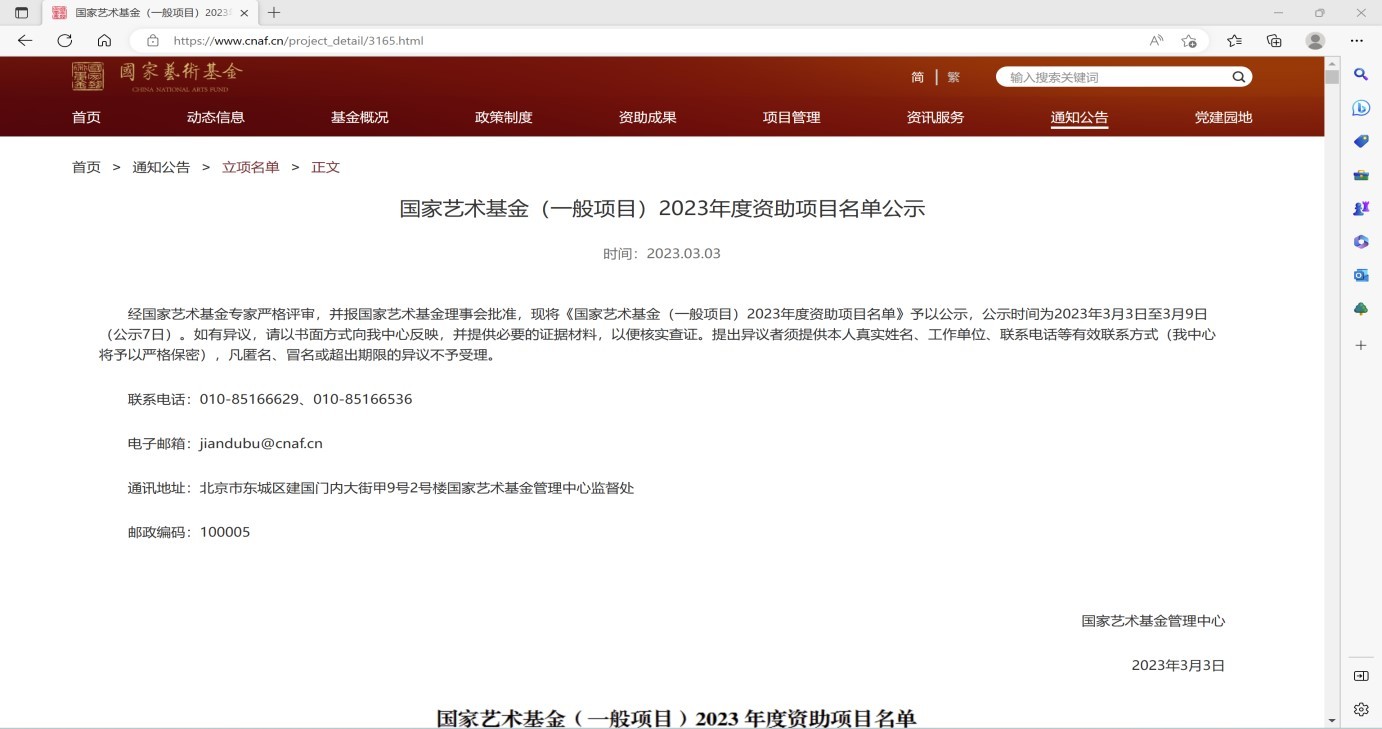 国家艺术基金管理中心3月3日发布《国家艺术基金(一般项目)2023年度资助项目名单公示》,我校美术学院教师陈建江,获青年艺术创作人才项目(中国画创作)立项,也是我校唯一在获得此类立项的项目。