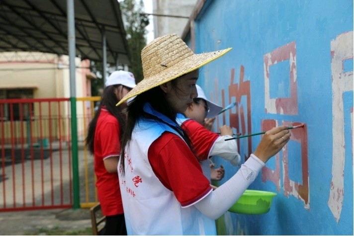 6月16日下午实践活动结束后,在美术学院分团委副书记许荣军老师的带领下,美术学院和各个学院分团委的志愿者们给红锦村村民家中的墙面进行设计与绘画,给枯燥的房子增添了一抹亮丽色彩,为乡村振兴奉献自己的绵薄之力。