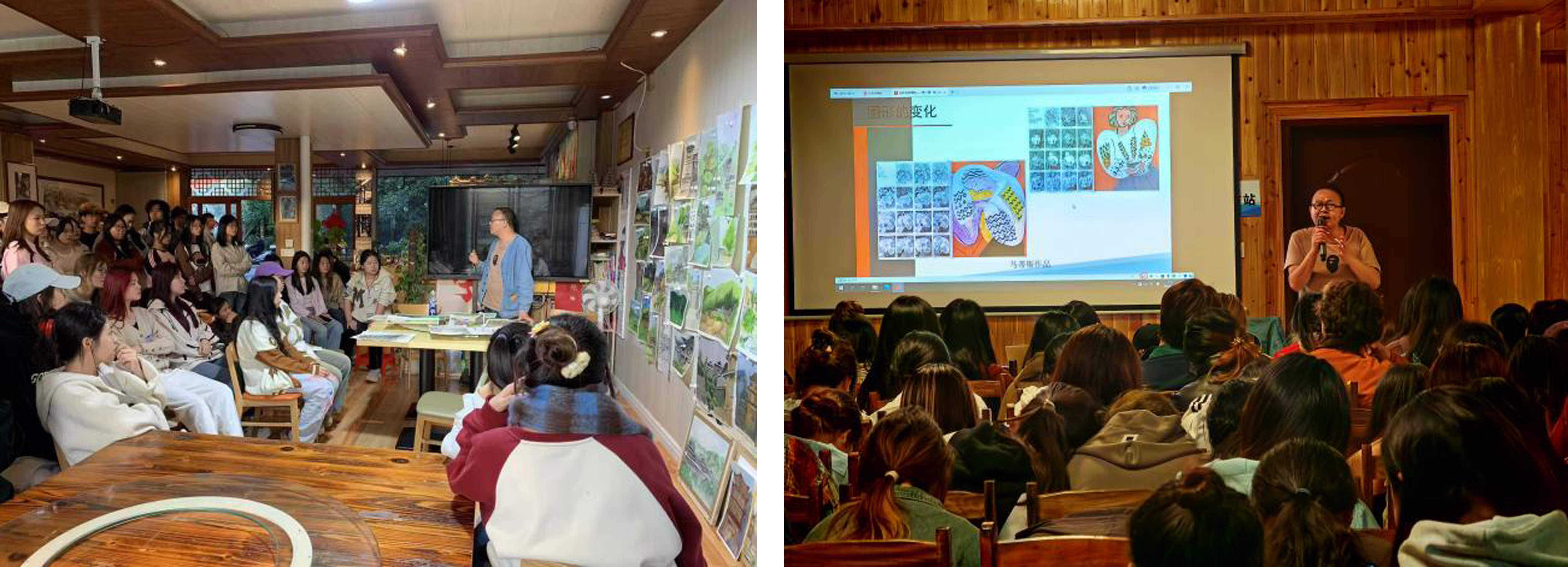 写生过程中陈政军教授与龙义敏教授为方便学生最直观、最快速地了解自己所在专业的基本特性,进行了写生示范与点评,并分别针对绘画和美术学专业开展了《人文关怀·与时俱进·实验创新—绘画艺术创作之我见》《创作表现(画面结构、形的变化)》讲座,学生反映热烈,纷纷表示收获颇丰。除两位教授外,学院自有教师也分别对任教班级进行了写生示范与作品点评。学习之外,师生们一起参加了当地的百家宴活动。在教授和自有教师的通力合作下,学生们的写生实践充实而有趣。