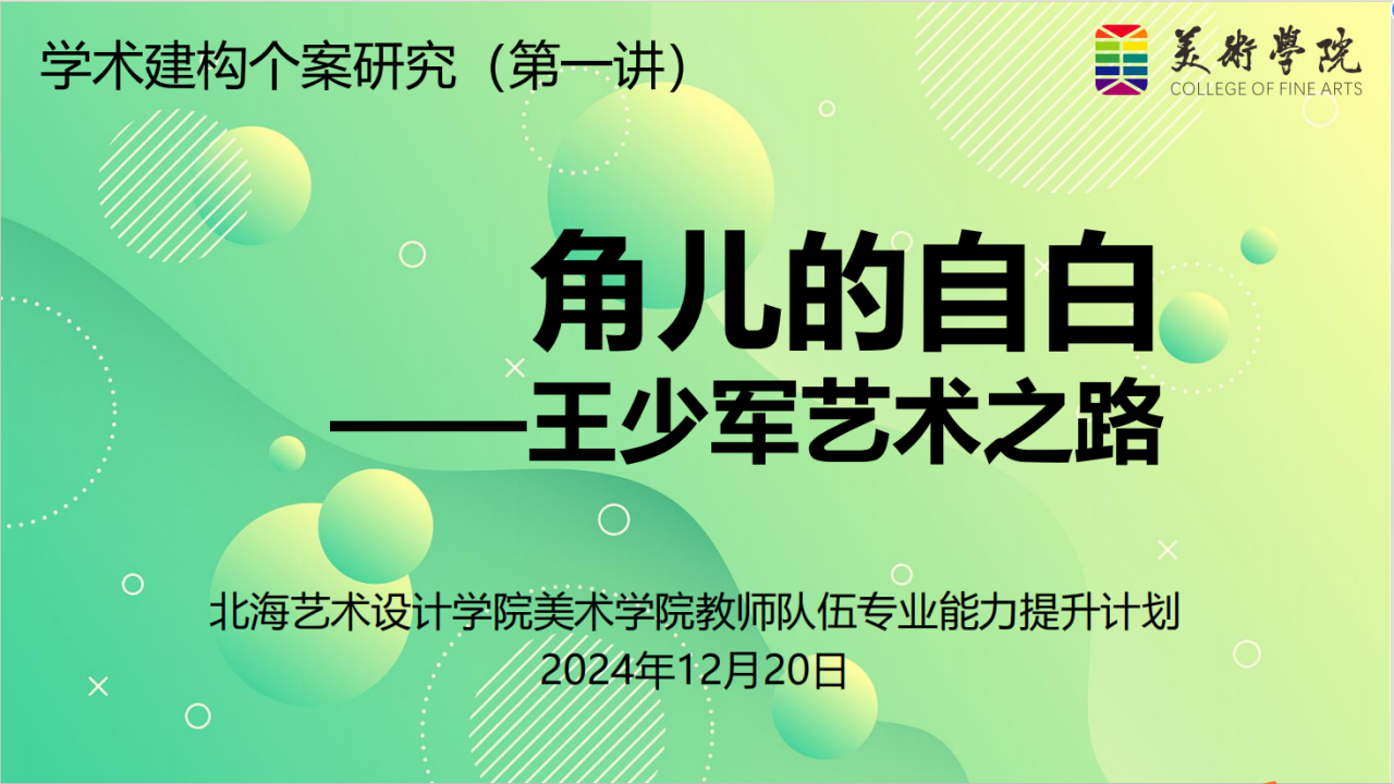 12月20日下午,美术学院在艺术楼314室成功举办了“教师队伍专业能力提升计划”系列课程的第一讲。本次授课“角儿的自白——王少军艺术之路”为主题讲座形式开展,由美术学院雕塑专业学科带头人、著名雕塑艺术家王少军教授主讲。此次讲座标志着北海艺术设计学院美术学院教师队伍专业能力提升计划”正式启动讲座由学院办公室主任李康楠主持,出席人员包括院长刘斌教授、执行院长龚为教授、副院长金凯婧、副院长陈建江以及雕塑、绘画、美术学专业的专任教师。