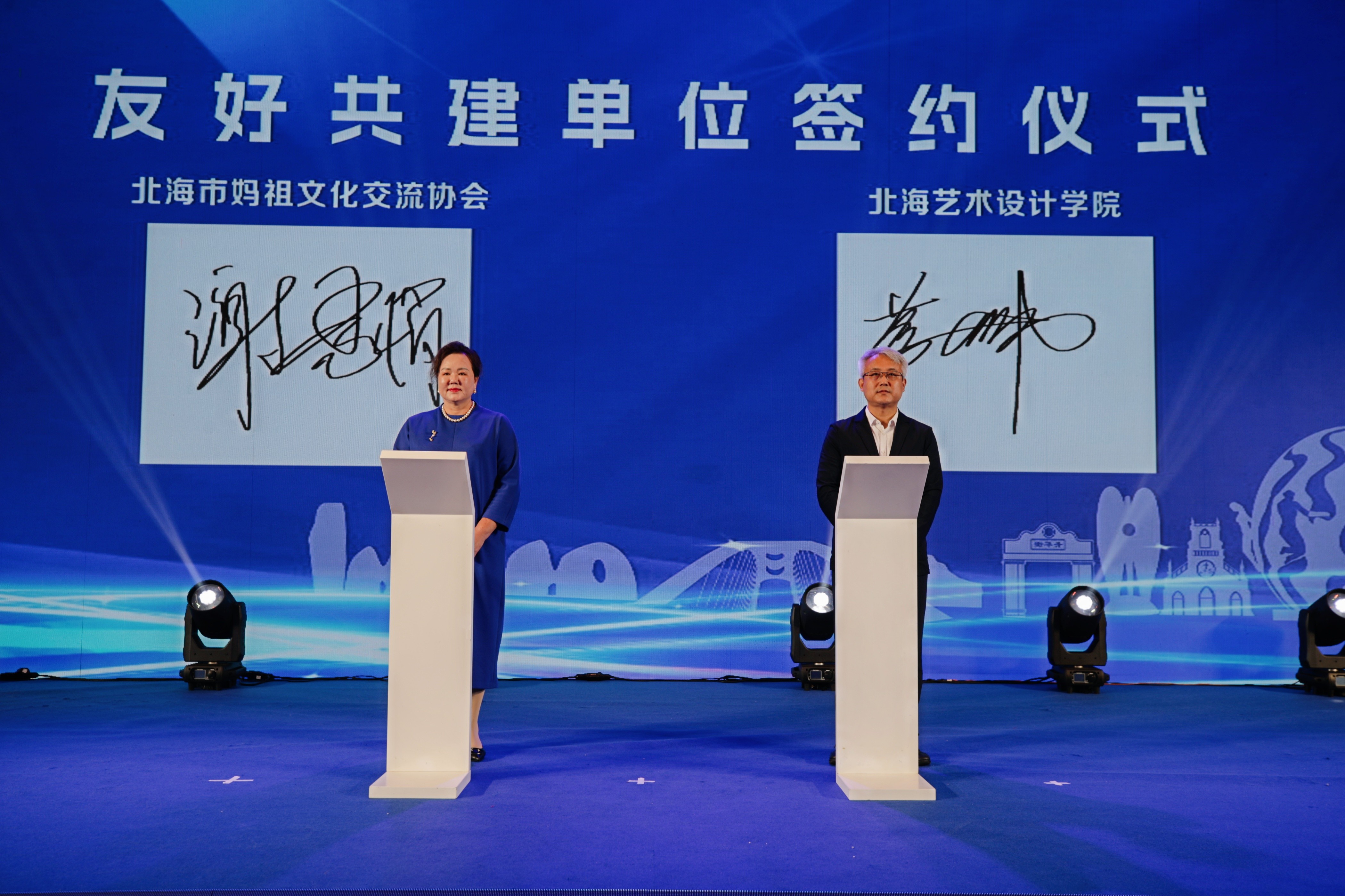 11月24日,广西北海妈祖文化交流协会成立庆典在北海香格里拉大酒店隆重举行,《中华妈祖志・广西卷》编纂筹委会同步揭牌。柬埔寨、新加坡、马来西亚等东盟国家妈祖社团及加拿大、山东、浙江、福建等国内外妈祖文化机构代表齐聚现场,共同见证这一传承海丝文脉、深化跨境交流的文化盛事。建筑与环境艺术学院副院长蔡世伟及教师代表陈欧阳、冀智清受邀出席活动,深度参与妈祖文化传承与发展合作。