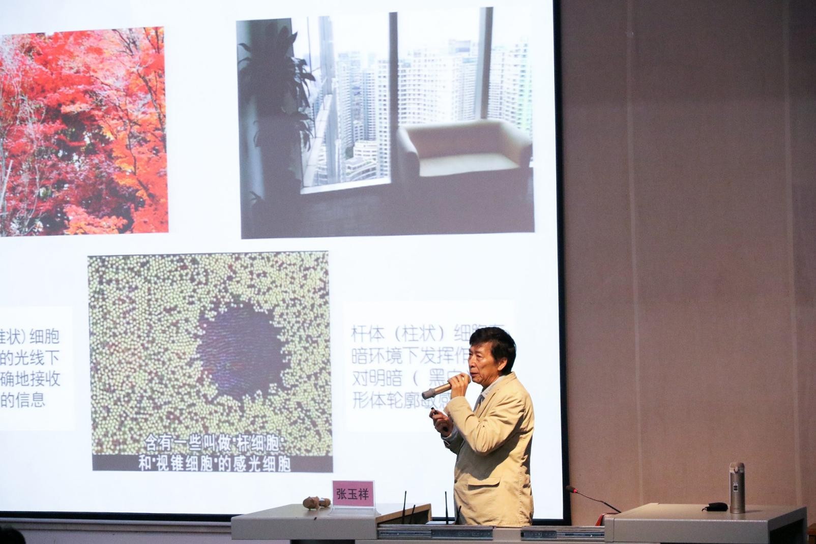 讲座开始,张玉祥教授首先从最根本的人体生物感色开始介绍色彩世界,并讲述了色彩所覆盖的领域。色彩的运用极其广泛,例如绘画、医学与心理学、传统文化与民间艺术……张玉祥教授鼓励学生们“带上专业的眼睛,去收集‘好’色彩与‘坏’色彩,不断地开阔艺术视野,培养自身的艺术气质。张玉祥教授表示多去涉猎色彩的不同领域、范围或者学科,能更好地去开拓色彩的视野,进一步提升自我。
