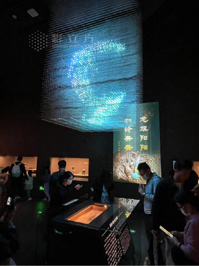 为了更鲜活地展示这件宝物,彩立方提供了拥有发明专利三维灯光艺术装置运用裸眼真3D的艺术灯光将“龙图腾”生动演绎,映衬着绿松石龙形器,彼此相得益彰,让文物“活”起来,助力中国考古博物馆镇馆之宝的精彩亮相!