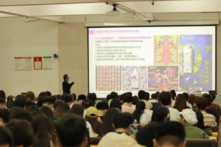 3月11日晚,于我校西校区伦理楼107,中国美术学院教授、博士生导师范凯熹为我校师生带来一场题为《中国文化基因符号转译与国潮风的AI生成式设计》的精彩讲座,讲座由设计艺术学院副院长白建强主持。